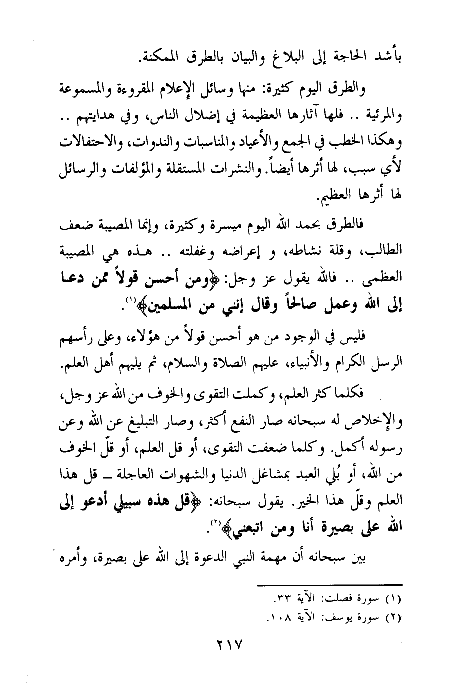فكلما كثر العلم، وكملت التقوى والخوف من الله عز وجل، والإخلاص له سبحانه صار النفع أكثر، وصار التبليغ عن الله وعن رسوله أكمل. وكلما ضعفت التقوى، أو قل العلم، أو قل الخوف من الله، أو بلي العبد بمشاغل الدنيا والشهوات العاجلة - قل هذا العلم وقل هذا الخير. يقول سبحانه: {قُلْ هَذِهِ سَبِيلِي أَدْعُو إِلَى اللَّهِ عَلَى بَصِيرَةٍ أَنَا وَمَنِ اتَّبَعَنِي} (¬2) بين سبحانه أن مهمة النبي الدعوة إلى الله على بصيرة، وأمره
