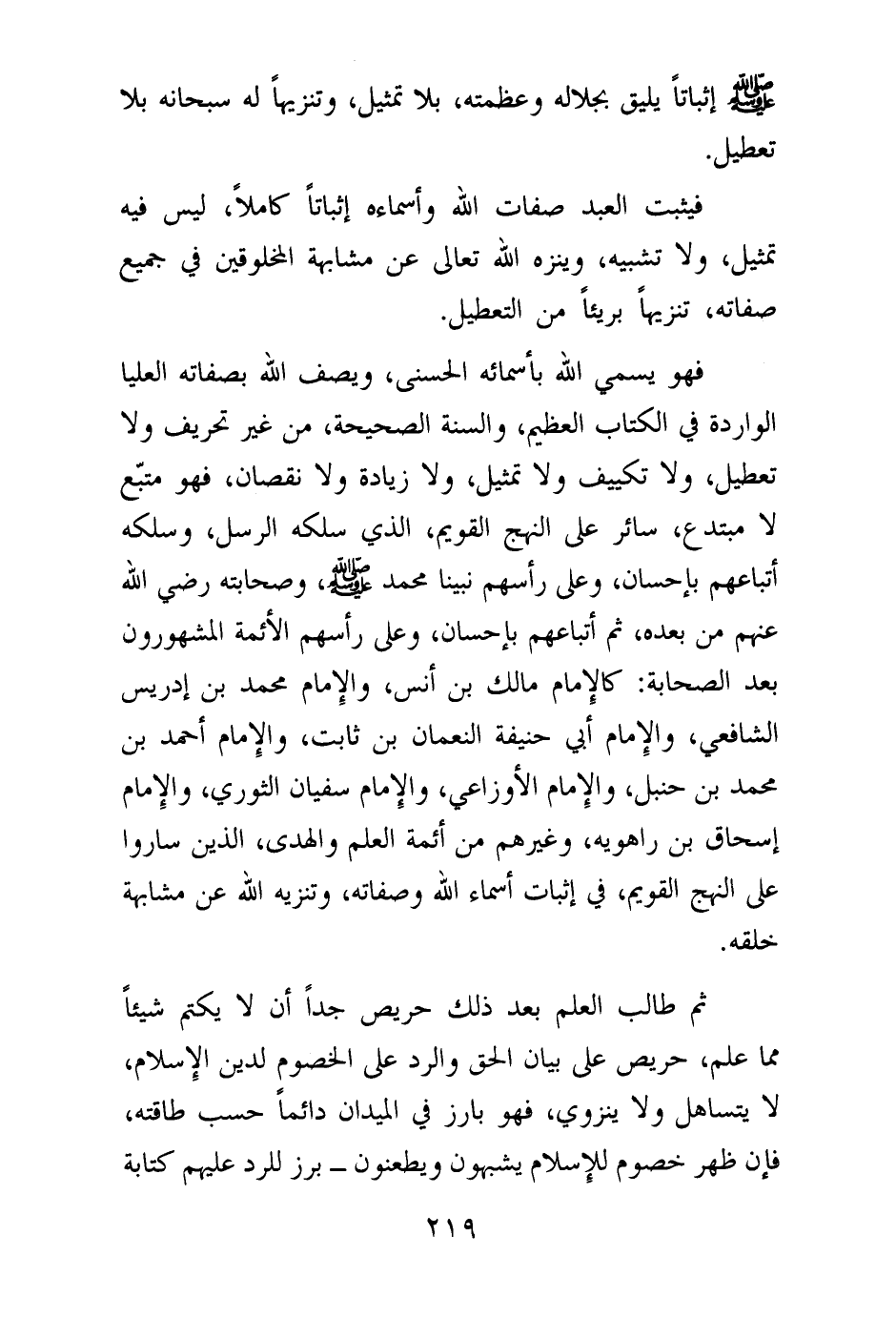 فهو يسمي الله بأسمائه الحسنى، ويصف الله بصفاته العليا الواردة في الكتاب العظيم، والسنة الصحيحة، من غير تحريف ولا تعطيل، ولا تكييف ولا تمثيل، ولا زيادة ولا نقصان، فهو متبع لا مبتدع، سائر على النهج القويم، الذي سلكه الرسل، وسلكه أتباعهم بإحسان، وعلى رأسهم نبينا محمد صلى الله عليه وسلم، وصحابته رضي الله عنهم من بعده، ثم أتباعهم بإحسان، وعلى رأسهم الأئمة المشهورون بعد الصحابة: كالإمام مالك بن أنس، والإمام محمد بن إدريس الشافعي، والإمام أبي حنيفة النعمان بن ثابت، والإمام أحمد بن محمد بن حنبل، والإمام الأوزاعي، والإمام سفيان الثوري، والإمام إسحاق بن راهويه، وغيرهم من أئمة العلم والهدى، الذين ساروا على النهج القويم، في إثبات أسماء الله وصفاته، وتنزيه الله عن مشابهة خلقه.