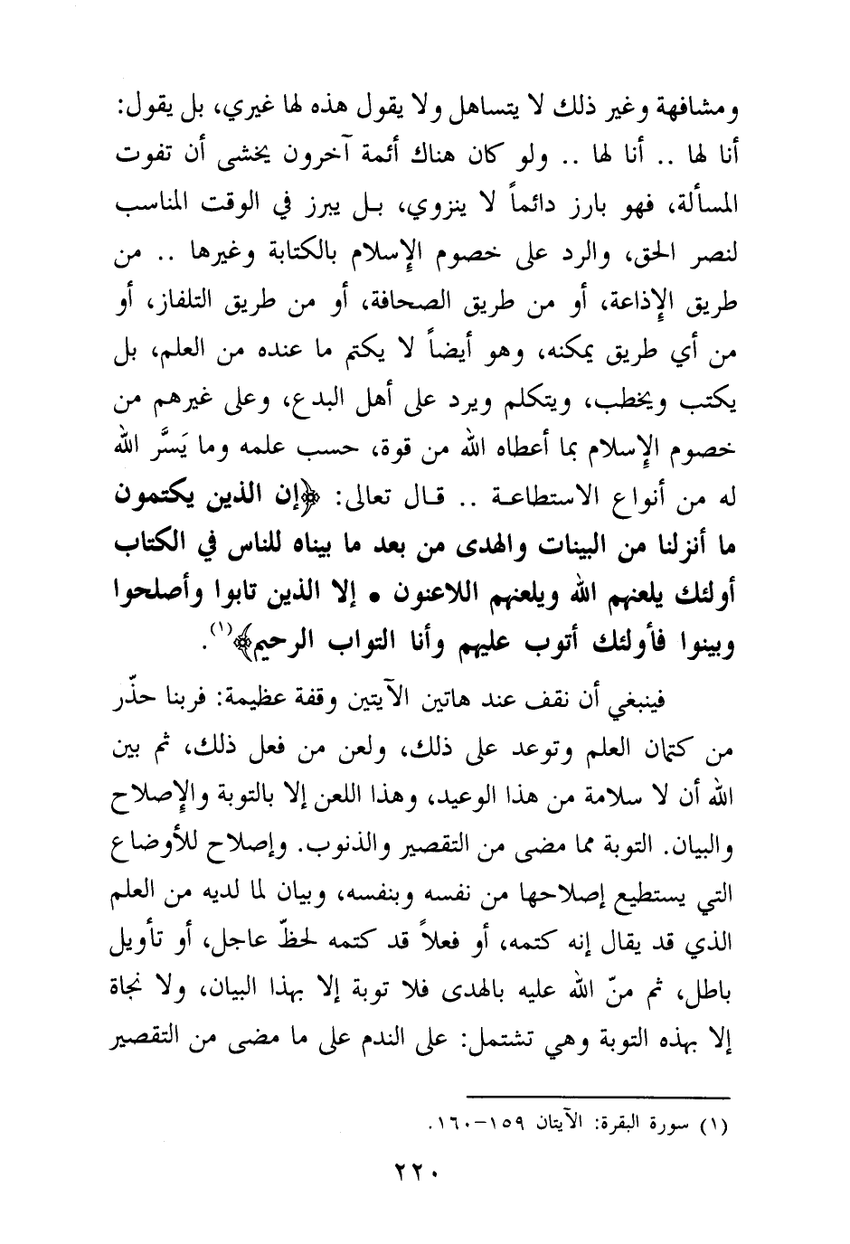 ومشافهة وغير ذلك لا يتساهل ولا يقول هذه لها غيري، بل يقول: أنا لها. . أنا لها. . ولو كان هناك أئمة آخرون يخشى أن تفوت المسألة، فهو بارز دائما لا ينزوي، بل يبرز في الوقت المناسب لنصر الحق، والرد على خصوم الإسلام بالكتابة وغيرها. . من طريق الإذاعة، أو من طريق الصحافة، أو من طريق التلفاز، أو من أي طريق يمكنه، وهو أيضا لا يكتم ما عنده من العلم، بل يكتب ويخطب، ويتكلم ويرد على أهل البدع، وعلى غيرهم من خصوم الإسلام بما أعطاه الله من قوة، حسب علمه وما يسر الله له من أنواع الاستطاعة. . قال تعالى: {إِنَّ الَّذِينَ يَكْتُمُونَ مَا أَنْزَلْنَا مِنَ الْبَيِّنَاتِ وَالْهُدَى مِنْ بَعْدِ مَا بَيَّنَّاهُ لِلنَّاسِ فِي الْكِتَابِ أُولَئِكَ يَلْعَنُهُمُ اللَّهُ وَيَلْعَنُهُمُ اللَّاعِنُونَ} (¬1) {إِلَّا الَّذِينَ تَابُوا وَأَصْلَحُوا وَبَيَّنُوا فَأُولَئِكَ أَتُوبُ عَلَيْهِمْ وَأَنَا التَّوَّابُ الرَّحِيمُ} (¬2)