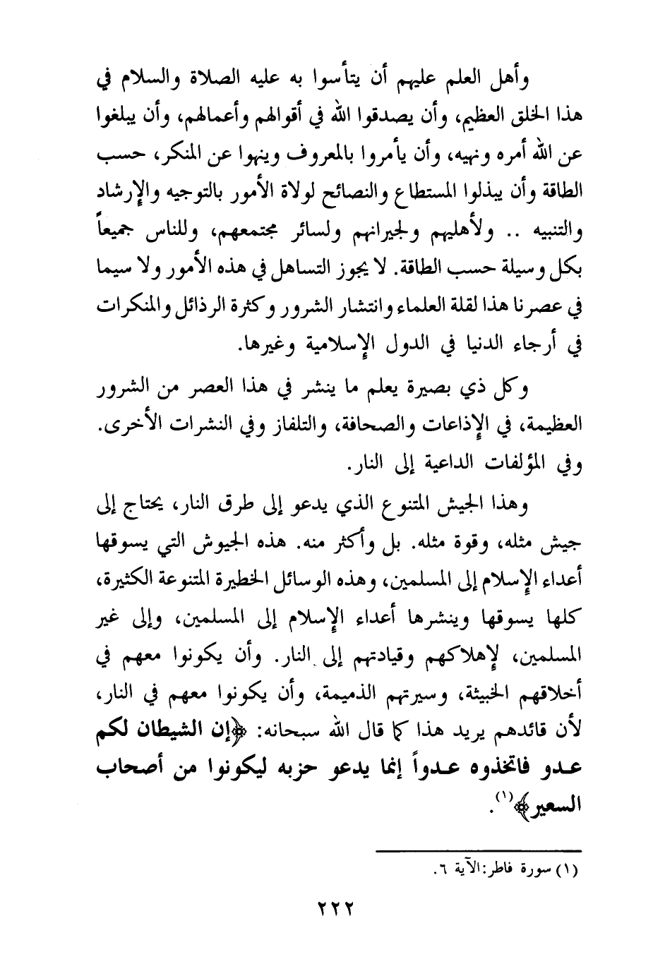 وكل ذي بصيرة يعلم ما ينشر في هذا العصر من الشرور العظيمة، في الإذاعات والصحافة، والتلفاز وفي النشرات الأخرى. وفي المؤلفات الداعية إلى النار.