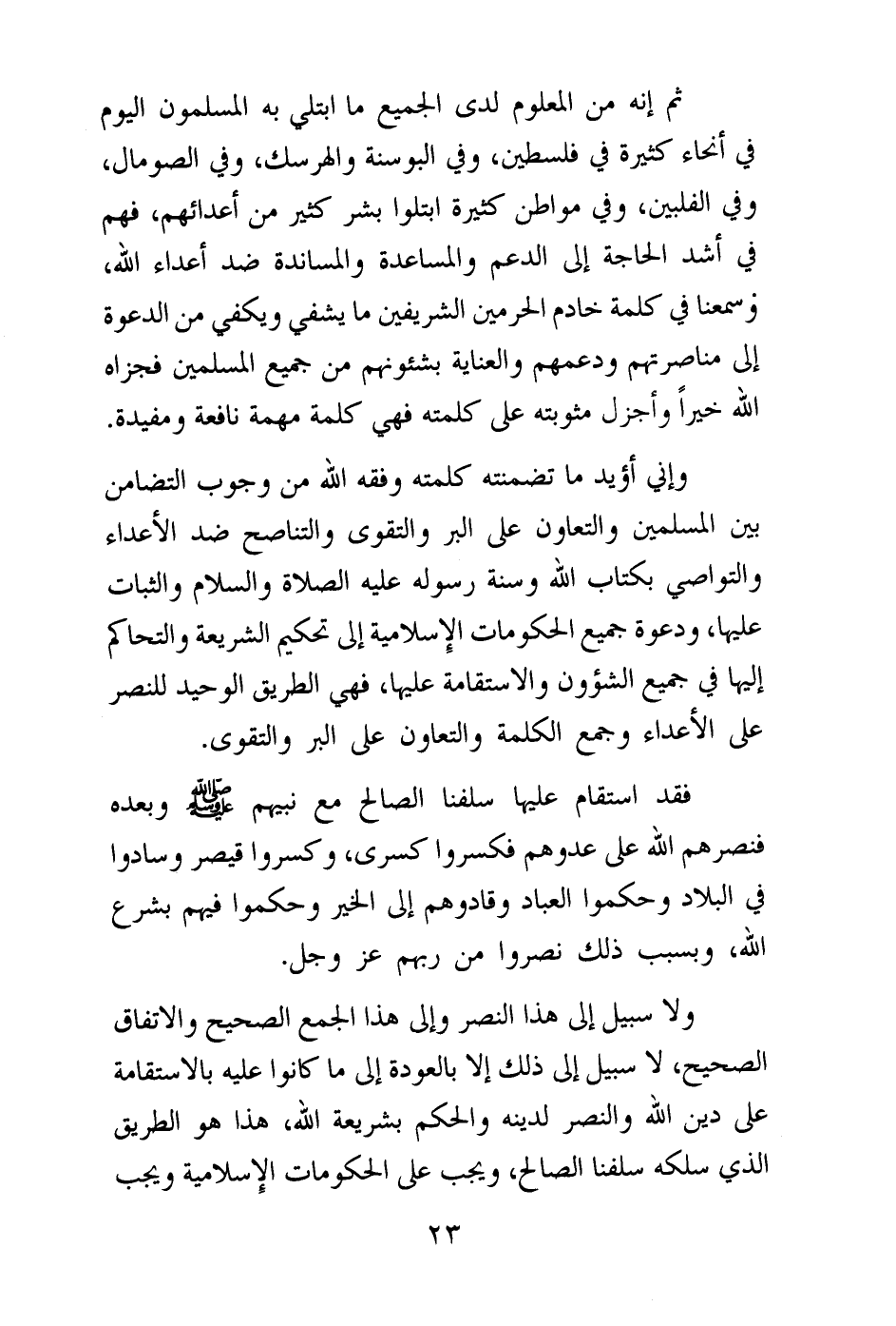 وإني أؤيد ما تضمنته كلمته وفقه الله من وجوب التضامن بين المسلمين والتعاون على البر والتقوى والتناصح ضد الأعداء والتواصي بكتاب الله وسنة رسوله عليه الصلاة والسلام والثبات عليها، ودعوة جميع الحكومات الإسلامية إلى تحكيم الشريعة والتحاكم إليها في جميع الشئون والاستقامة عليها، فهي الطريق الوحيد للنصر على الأعداء وجمع الكلمة والتعاون على البر والتقوى.