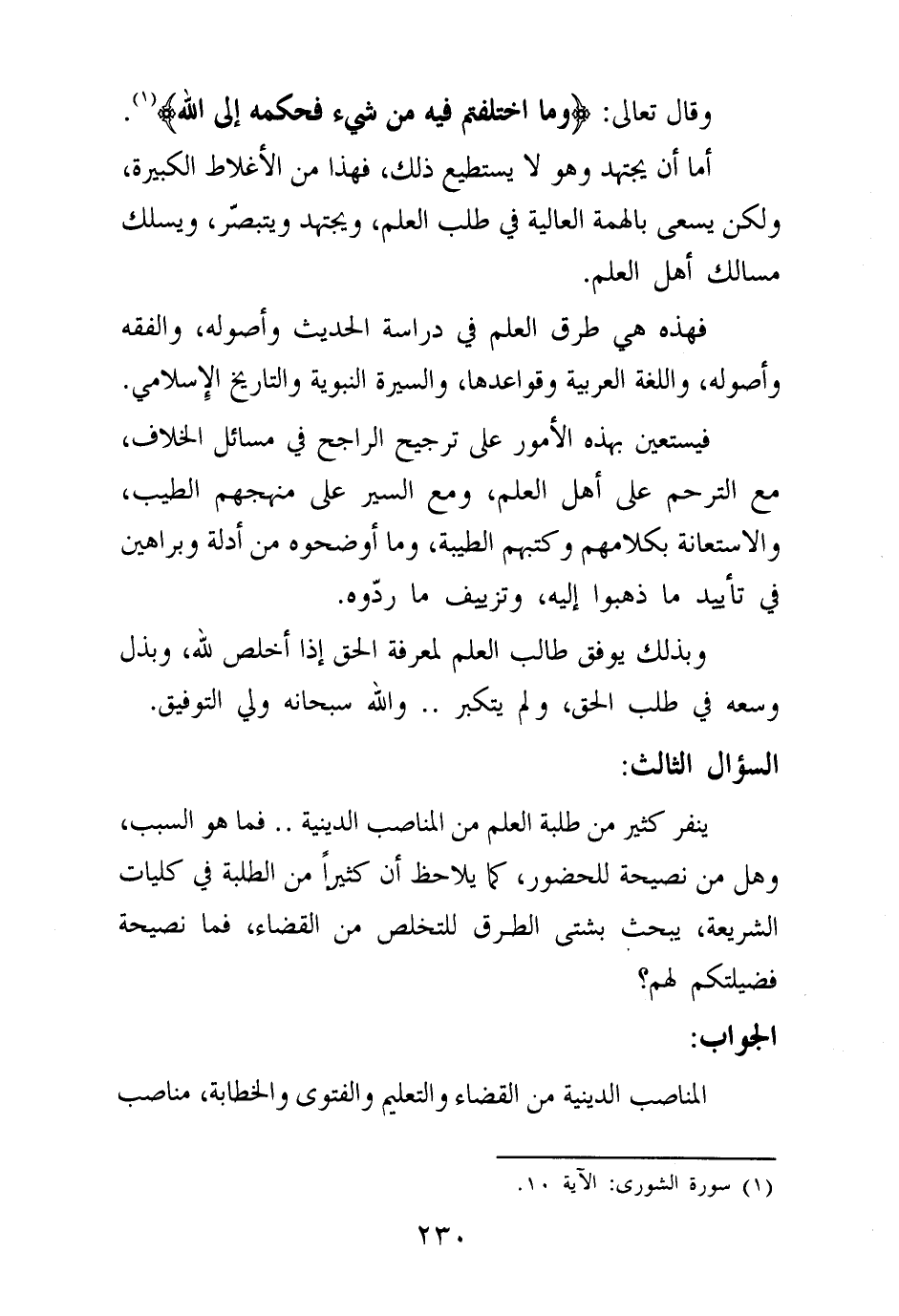 وقال تعالى: {وَمَا اخْتَلَفْتُمْ فِيهِ مِنْ شَيْءٍ فَحُكْمُهُ إِلَى اللَّهِ} (¬1) أما أن يجتهد وهو لا يستطيع ذلك، فهذا من الأغلاط الكبيرة، ولكن يسعى بالهمة العالية في طلب العلم، ويجتهد ويتبصر، ويسلك مسالك أهل العلم.