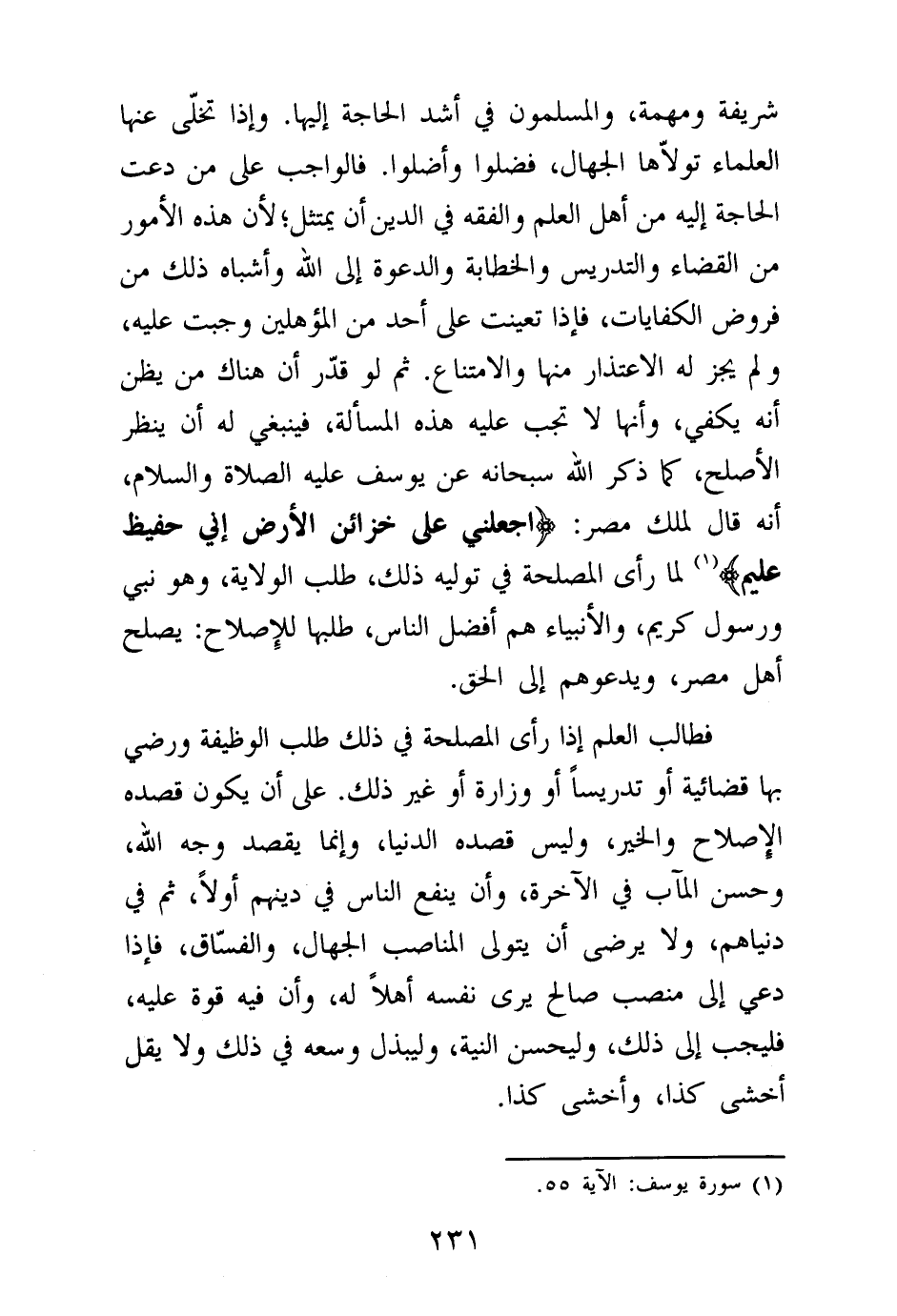 فالواجب على من دعت الحاجة إليه من أهل العلم والفقه في الدين أن يمتثل؛ لأن هذه الأمور من القضاء والتدريس والخطابة والدعوة إلى الله وأشباه ذلك من فروض الكفايات، فإذا تعينت على أحد من المؤهلين وجبت عليه، ولم يجز له الاعتذار منها والامتناع. ثم لو قدر أن هناك من يظن أنه يكفي، وأنها لا تجب عليه هذه المسألة، فينبغي له أن ينظر الأصلح، كما ذكر الله سبحانه عن يوسف عليه الصلاة والسلام، أنه قال لملك مصر: {اجْعَلْنِي عَلَى خَزَائِنِ الْأَرْضِ إِنِّي حَفِيظٌ عَلِيمٌ} (¬1) لما رأى المصلحة في توليه ذلك، طلب الولاية، وهو نبي ورسول كريم، والأنبياء هم أفضل الناس، طلبها للإصلاح: يصلح أهل مصر، ويدعوهم إلى الحق.