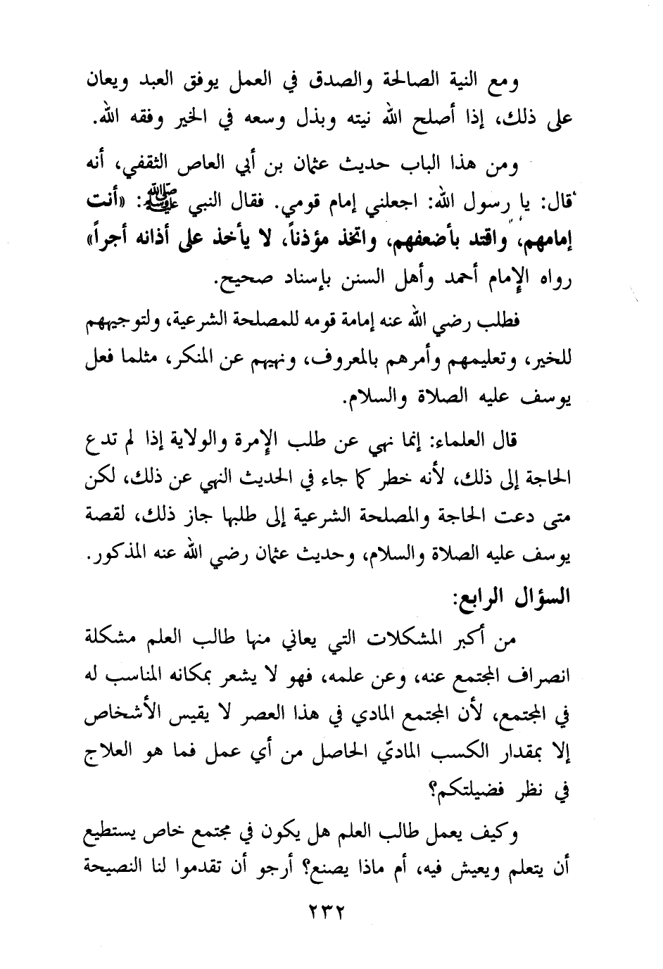 ومن هذا الباب «حديث عثمان بن أبي العاص الثقفي، أنه قال: يا رسول الله: اجعلني إمام قومي. فقال النبي صلى الله عليه وسلم: أنت إمامهم واقتد بأضعفهم واتخذ مؤذنا لا يأخذ على أذانه أجرا (¬1) » ، رواه الإمام أحمد وأهل السنن بإسناد صحيح. فطلب رضي الله عنه إمامة قومه للمصلحة الشرعية، ولتوجيههم للخير، وتعليمهم وأمرهم بالمعروف، ونهيهم عن المنكر، مثلما فعل يوسف عليه الصلاة والسلام.