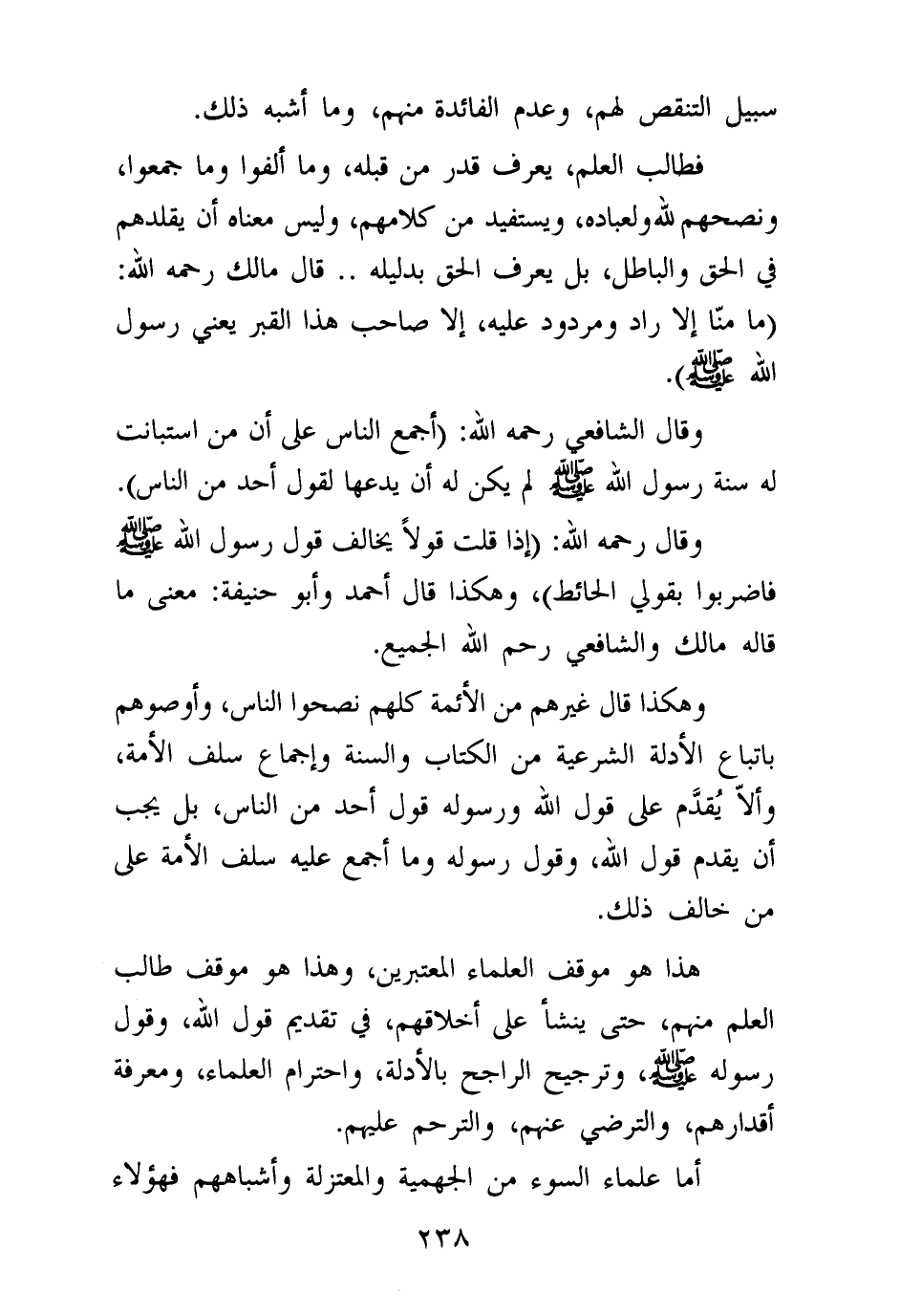 وهكذا قال غيرهم من الأئمة كلهم نصحوا الناس، وأوصوهم باتباع الأدلة الشرعية من الكتاب والسنة وإجماع سلف الأمة، وألا يقدم على قول الله ورسوله قول أحد من الناس، بل يجب أن يقدم قول الله، وقول رسوله وما أجمع عليه سلف الأمة على من خالف ذلك.