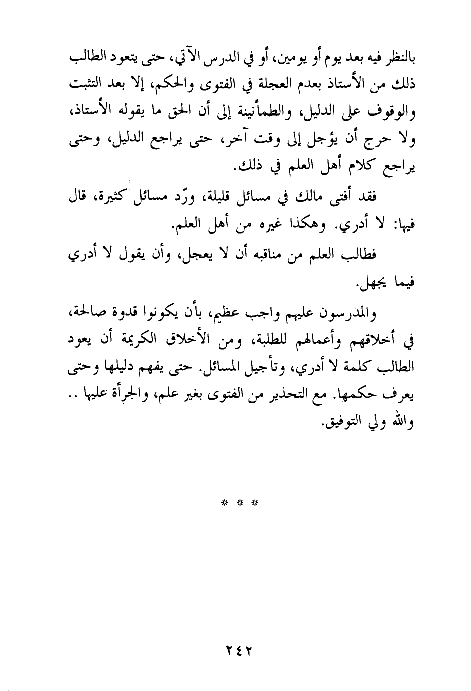 والمدرسون عليهم واجب عظيم، بأن يكونوا قدوة صالحة، في أخلاقهم وأعمالهم للطلبة، ومن الأخلاق الكريمة أن يعود الطالب كلمة لا أدري، وتأجيل المسائل. حتى يفهم دليلها وحتى يعرف حكمها. مع التحذير من الفتوى بغير علم، والجرأة عليها. .