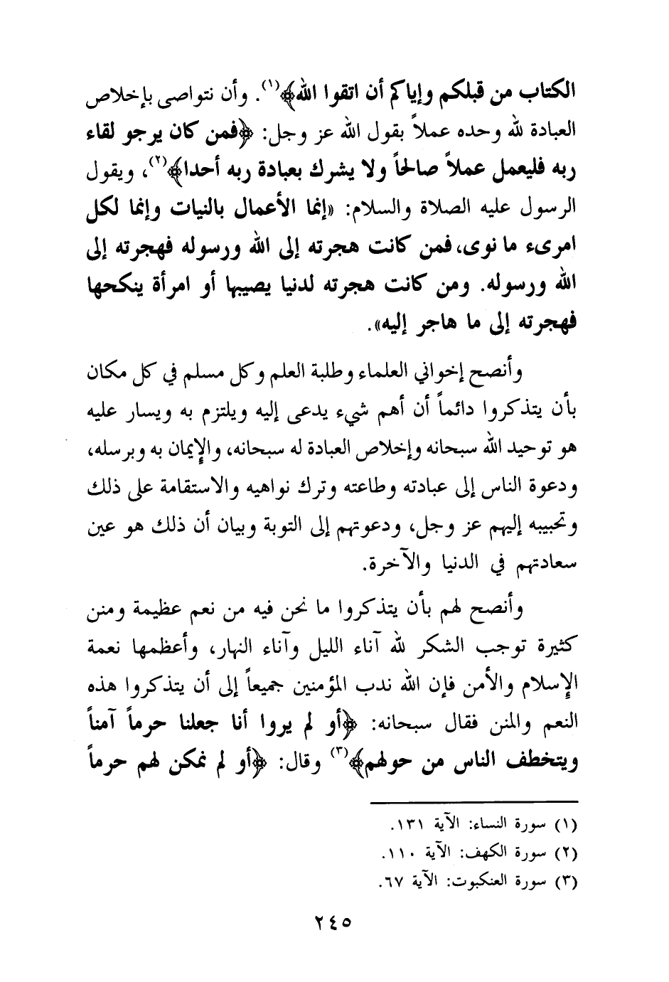 وأن نتواصى بإخلاص العبادة لله وحده عملا بقول الله عز وجل: {فَمَنْ كَانَ يَرْجُوا لِقَاءَ رَبِّهِ فَلْيَعْمَلْ عَمَلًا صَالِحًا وَلَا يُشْرِكْ بِعِبَادَةِ رَبِّهِ أَحَدًا} (¬1) ويقول الرسول عليه الصلاة والسلام: «إنما الأعمال بالنيات وإنما لكل امرئ ما نوى فمن كانت هجرته إلى الله ورسوله فهجرته إلى الله ورسوله ومن كانت هجرته لدنيا يصيبها أو امرأة ينكحها فهجرته إلى ما هاجر إليه (¬2) » .
