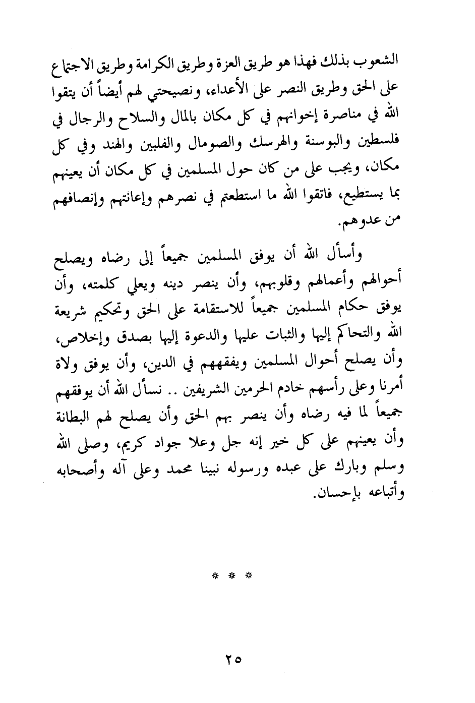 الشعوب بذلك فهذا هو طريق العزة وطريق الكرامة وطريق الاجتماع على الحق وطريق النصر على الأعداء، ونصيحتي لهم أيضا أن يتقوا الله في مناصرة إخوانهم في كل مكان بالمال والسلاح والرجال في فلسطين والبوسنة والهرسك والصومال والفلبين والهند وفي كل مكان، ويجب على من كان حول المسلمين في كل مكان أن يعينهم بما يستطيع، فاتقوا الله ما استطعتم في نصرهم وإعانتهم وإنصافهم من عدوهم.