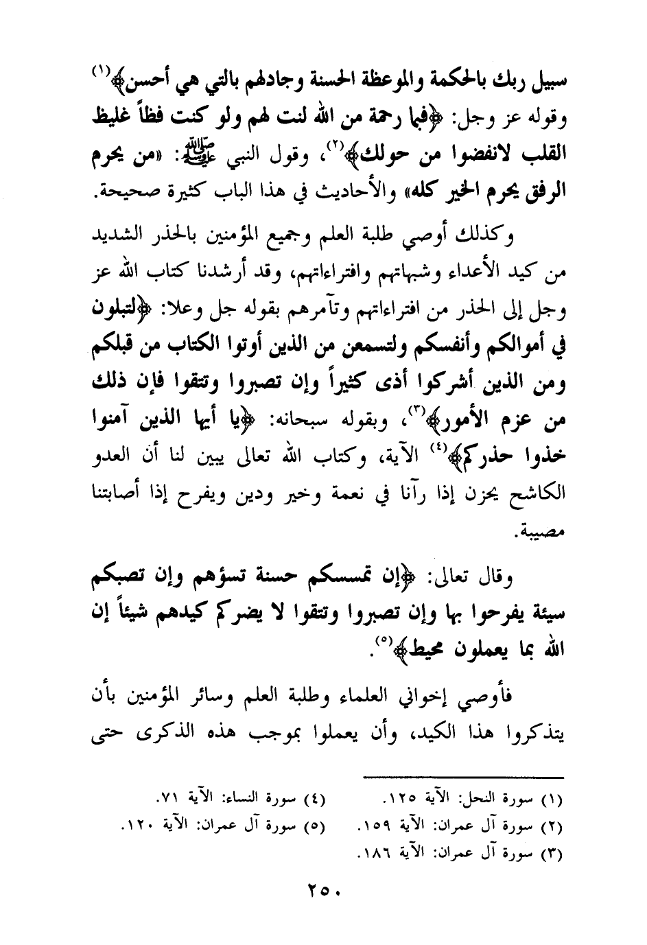 وقال تعالى: {إِنْ تَمْسَسْكُمْ حَسَنَةٌ تَسُؤْهُمْ وَإِنْ تُصِبْكُمْ سَيِّئَةٌ يَفْرَحُوا بِهَا وَإِنْ تَصْبِرُوا وَتَتَّقُوا لَا يَضُرُّكُمْ كَيْدُهُمْ شَيْئًا إِنَّ اللَّهَ بِمَا يَعْمَلُونَ مُحِيطٌ} (¬6) فأوصي إخواني العلماء وطلبة العلم وسائر المؤمنين بأن يتذكروا هذا الكيد، وأن يعملوا بموجب هذه الذكرى حتى