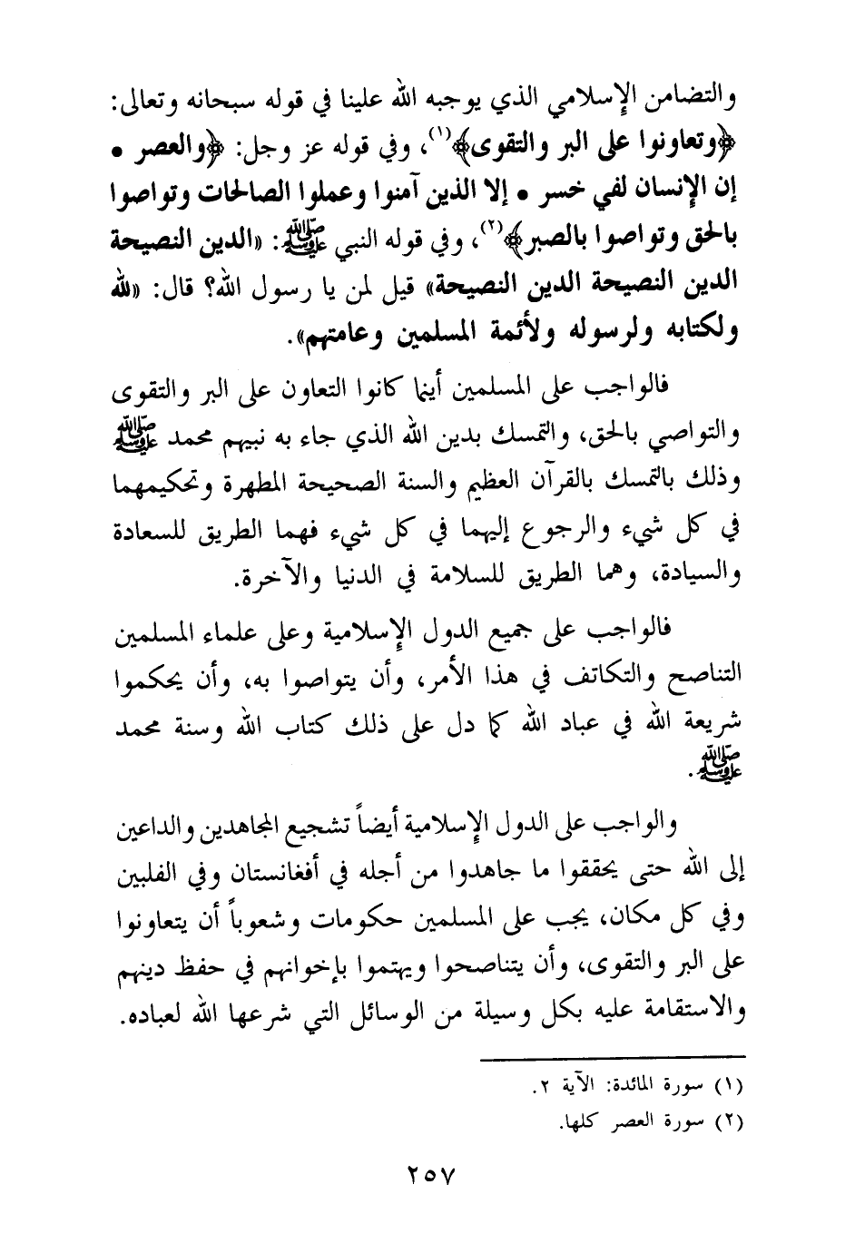 والتضامن الإسلامي الذي يوجبه الله علينا في قوله سبحانه وتعالى: {وَتَعَاوَنُوا عَلَى الْبِرِّ وَالتَّقْوَى} (¬1) وفي قوله عز وجل: {وَالْعَصْرِ} (¬2) {إِنَّ الْإِنْسَانَ لَفِي خُسْرٍ} (¬3) {إِلَّا الَّذِينَ آمَنُوا وَعَمِلُوا الصَّالِحَاتِ وَتَوَاصَوْا بِالْحَقِّ وَتَوَاصَوْا بِالصَّبْرِ} (¬4) وفي قول النبي صلى الله عليه وسلم: «الدين النصيحة الدين النصيحة الدين النصيحة قيل: لمن يا رسول الله؟ قال: لله ولكتابه ولرسوله ولأئمة المسلمين وعامتهم (¬5) » .