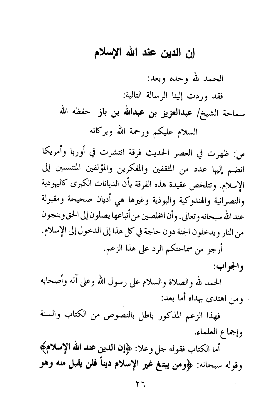 س: ظهرت في العصر الحديث فرقة انتشرت في أوربا وأمريكا انضم إليها عدد من المثقفين والمفكرين والمؤلفين المنتسبين إلى الإسلام. وتتلخص عقيدة هذه الفرقة بأن الديانات الكبرى كاليهودية والنصرانية والهندوكية والبوذية وغيرها هي أديان صحيحة ومقبولة عند الله سبحانه وتعالى. وأن المخلصين من أتباعها يصلون إلى الحق وينجون من النار ويدخلون الجنة دون حاجة في كل هذا إلى الدخول إلى الإسلام. .
