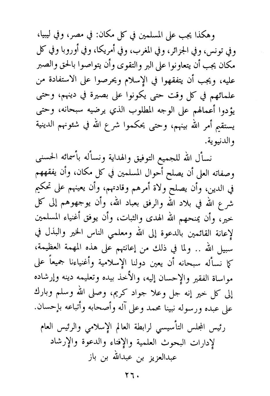 نسأل الله للجميع التوفيق والهداية ونسأله بأسمائه الحسنى وصفاته العلى أن يصلح أحوال المسلمين في كل مكان، وأن يفقههم في الدين، وأن يصلح ولاة أمرهم وقادتهم، وأن يعينهم على تحكيم شرع الله في بلاد الله والرفق بعباد الله، وأن يوجهوهم إلى كل خير، وأن يمنحهم الله الهدى والثبات، وأن يوفق أغنياء المسلمين لإعانة القائمين بالدعوة إلى الله ومعلمي الناس الخير والبذل في سبيل الله. . ولما في ذلك من إعانتهم على هذه المهمة العظيمة، كما نسأله سبحانه أن يعين دولنا الإسلامية وأغنياءنا جميعا على مواساة الفقير والإحسان إليه، والأخذ بيده وتعليمه دينه وإرشاده إلى كل خير إنه جل وعلا جواد كريم، وصلى الله وسلم وبارك على عبده ورسوله نبينا محمد وعلى آله وأصحابه وأتباعه بإحسان.