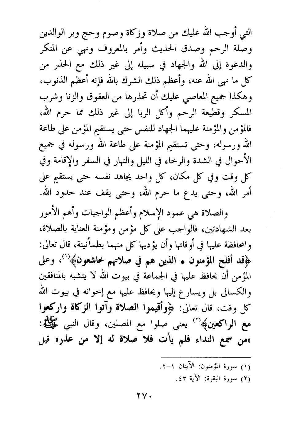 والصلاة هي عمود الإسلام وأعظم الواجبات وأهم الأمور بعد الشهادتين، فالواجب على كل مؤمن ومؤمنة العناية بالصلاة، والمحافظة عليها في أوقاتها وأن يؤديها كل منهما بطمأنينة، قال تعالى: {قَدْ أَفْلَحَ الْمُؤْمِنُونَ} (¬1) {الَّذِينَ هُمْ فِي صَلَاتِهِمْ خَاشِعُونَ} (¬2) وعلى المؤمن أن يحافظ عليها في الجماعة في بيوت الله لا يتشبه بالمنافقين والكسالى بل ويسارع إليها ويحافظ عليها مع إخوانه في بيوت الله كل وقت، قال تعالى: {وَأَقِيمُوا الصَّلَاةَ وَآتُوا الزَّكَاةَ وَارْكَعُوا مَعَ الرَّاكِعِينَ} (¬3) يعني صلوا مع المصلين، وقال النبي صلى الله عليه وسلم: «من سمع النداء فلم يأت فلا صلاة له إلا من عذر، قيل
