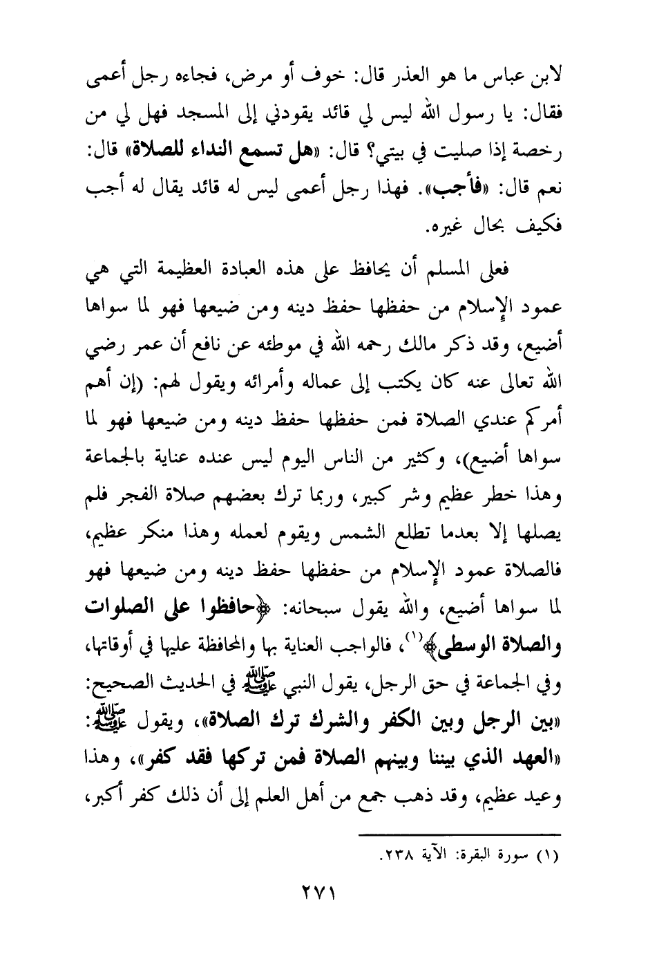 وكثير من الناس اليوم ليس عنده عناية بالجماعة وهذا خطر عظيم وشر كبير، وربما ترك بعضهم صلاة الفجر فلم يصلها إلا بعدما تطلع الشمس ويقوم لعمله وهذا منكر عظيم، فالصلاة عمود الإسلام من حفظها حفظ دينه ومن ضيعها فهو لما سواها أضيع، والله يقول سبحانه: {حَافِظُوا عَلَى الصَّلَوَاتِ وَالصَّلَاةِ الْوُسْطَى} (¬3) فالواجب العناية بها والمحافظة عليها في أوقاتها، وفي الجماعة في حق الرجل، يقول النبي صلى الله عليه وسلم في الحديث الصحيح: «بين الرجل وبين الكفر والشرك ترك الصلاة (¬4) » ، ويقول صلى الله عليه وسلم: «العهد الذي بيننا وبينهم الصلاة فمن تركها فقد كفر (¬5) » ، وهذا وعيد عظيم، وقد ذهب جمع من أهل العلم إلى أن ذلك كفر أكبر،