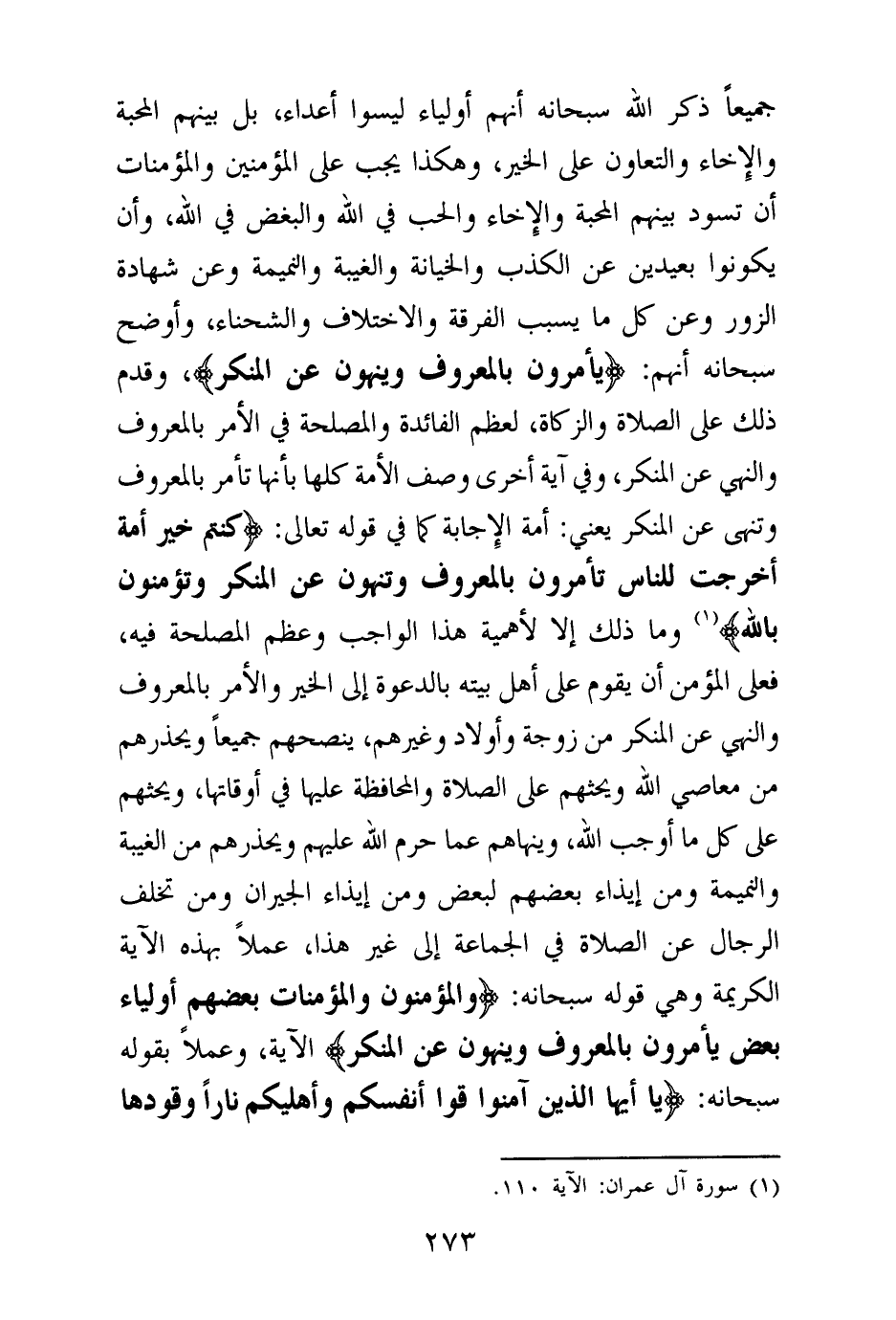 جميعا ذكر الله سبحانه أنهم أولياء ليسوا أعداء، بل بينهم المحبة والإخاء والتعاون على الخير، وهكذا يجب على المؤمنين والمؤمنات أن تسود بينهم المحبة والإخاء والحب في الله والبغض في الله، وأن يكونوا بعيدين عن الكذب والخيانة والغيبة والنميمة وعن شهادة الزور وعن كل ما يسبب الفرقة والاختلاف والشحناء، وأوضح سبحانه أنهم: {يَأْمُرُونَ بِالْمَعْرُوفِ وَيَنْهَوْنَ عَنِ الْمُنْكَرِ} (¬1) وقدم ذلك على الصلاة والزكاة، لعظم الفائدة والمصلحة في الأمر بالمعروف والنهي عن المنكر، وفي آية أخرى وصف الأمة كلها بأنها تأمر بالمعروف وتنهى عن المنكر يعني: أمة الإجابة كما في قوله تعالى: {كُنْتُمْ خَيْرَ أُمَّةٍ أُخْرِجَتْ لِلنَّاسِ تَأْمُرُونَ بِالْمَعْرُوفِ وَتَنْهَوْنَ عَنِ الْمُنْكَرِ وَتُؤْمِنُونَ بِاللَّهِ} (¬2) وما ذلك إلا لأهمية هذا الواجب وعظم المصلحة فيه.