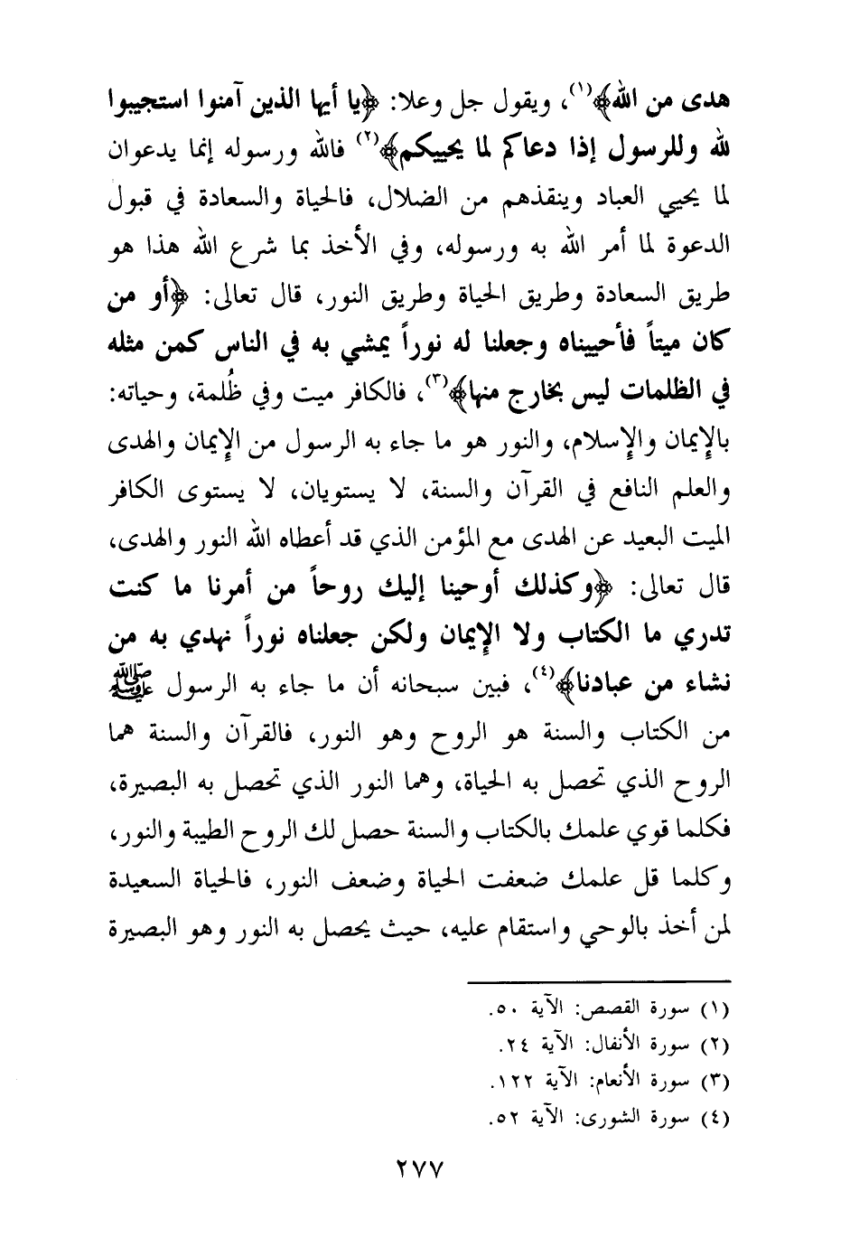 فبين سبحانه أن ما جاء به الرسول صلى الله عليه وسلم من الكتاب والسنة هو الروح وهو النور، فالقرآن والسنة هما الروح الذي تحصل به الحياة، وهما النور الذي تحصل به البصيرة، فكلما قوي علمك بالكتاب والسنة حصل لك الروح الطيبة والنور، وكلما قل علمك ضعفت الحياة وضعف النور، فالحياة السعيدة لمن أخذ بالوحي واستقام عليه، حيث يحصل به النور وهو البصيرة
