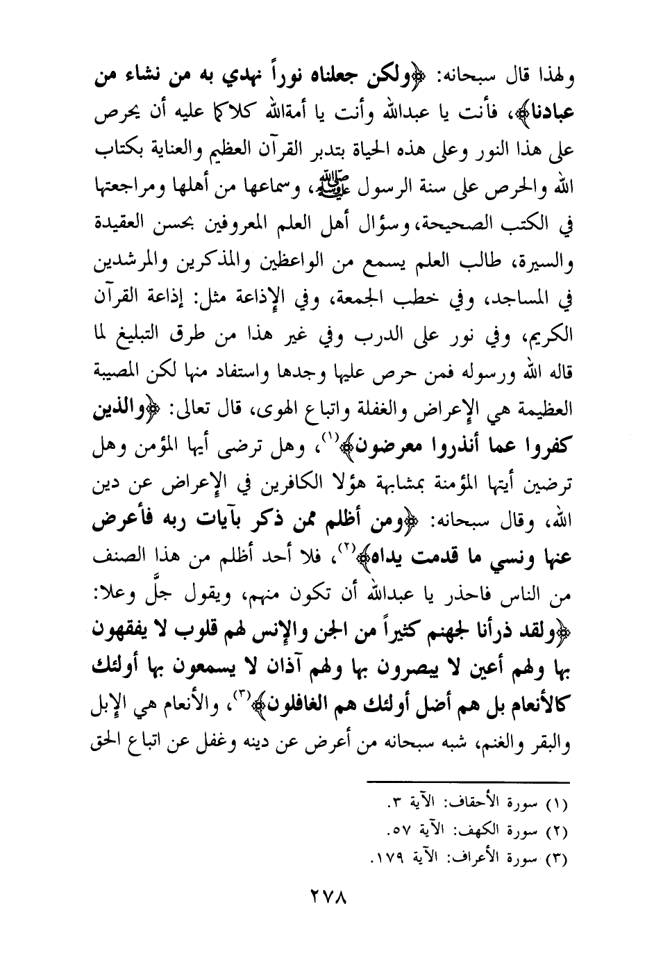 ولهذا قال سبحانه: {وَلَكِنْ جَعَلْنَاهُ نُورًا نَهْدِي بِهِ مَنْ نَشَاءُ مِنْ عِبَادِنَا} (¬1) فأنت يا عبد الله وأنت يا أمة الله كلاكما عليه أن يحرص على هذا النور وعلى هذه الحياة بتدبر القرآن العظيم والعناية بكتاب الله والحرص على سنة الرسول صلى الله عليه وسلم، وسماعها من أهلها ومراجعتها في الكتب الصحيحة، وسؤال أهل العلم المعروفين بحسن العقيدة والسيرة، طالب العلم يسمع من الواعظين والمذكرين والمرشدين في المساجد، وفي خطب الجمعة، وفي الإذاعة مثل: إذاعة القرآن الكريم، وفي نور على الدرب وفي غير هذا من طرق التبليغ لما قاله الله ورسوله فمن حرص عليها وجدها واستفاد منها لكن المصيبة العظيمة هي الإعراض والغفلة واتباع الهوى، قال تعالى: {وَالَّذِينَ كَفَرُوا عَمَّا أُنْذِرُوا مُعْرِضُونَ} (¬2) وهل ترضى أيها المؤمن وهل ترضين أيتها المؤمنة بمشابهة هؤلاء الكافرين في الإعراض عن دين الله، وقال سبحانه: {وَمَنْ أَظْلَمُ مِمَّنْ ذُكِّرَ بِآيَاتِ رَبِّهِ فَأَعْرَضَ عَنْهَا وَنَسِيَ مَا قَدَّمَتْ يَدَاهُ} (¬3) فلا أحد أظلم من هذا الصنف من الناس فاحذر يا عبد الله أن تكون منهم، ويقول جل وعلا: {وَلَقَدْ ذَرَأْنَا لِجَهَنَّمَ كَثِيرًا مِنَ الْجِنِّ وَالْإِنْسِ لَهُمْ قُلُوبٌ لَا يَفْقَهُونَ بِهَا وَلَهُمْ أَعْيُنٌ لَا يُبْصِرُونَ بِهَا وَلَهُمْ آذَانٌ لَا يَسْمَعُونَ بِهَا أُولَئِكَ كَالْأَنْعَامِ بَلْ هُمْ أَضَلُّ أُولَئِكَ هُمُ الْغَافِلُونَ} (¬4) والأنعام هي الإبل والبقر والغنم، شبه سبحانه من أعرض عن دينه وغفل عن اتباع الحق