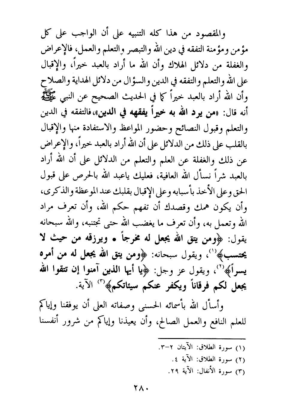 والمقصود من هذا كله التنبيه على أن الواجب على كل مؤمن ومؤمنة التفقه في دين الله والتبصر والتعلم والعمل، فالإعراض والغفلة من دلائل الهلاك وأن الله ما أراد بالعبد خيرا، والإقبال على الله والتعلم والتفقه في الدين والسؤال من دلائل الهداية والصلاح وأن الله أراد بالعبد خيرا كما في الحديث الصحيح عن النبي صلى الله عليه وسلم أنه قال: «من يرد الله به خيرا يفقهه في الدين (¬1) » ، فالتفقه في الدين والتعلم وقبول النصائح وحضور المواعظ والاستفادة منها والإقبال بالقلب على ذلك من الدلائل على أن الله أراد بالعبد خيرا، والإعراض عن ذلك والغفلة عن العلم والتعلم من الدلائل على أن الله أراد بالعبد شرا نسأل الله العافية.