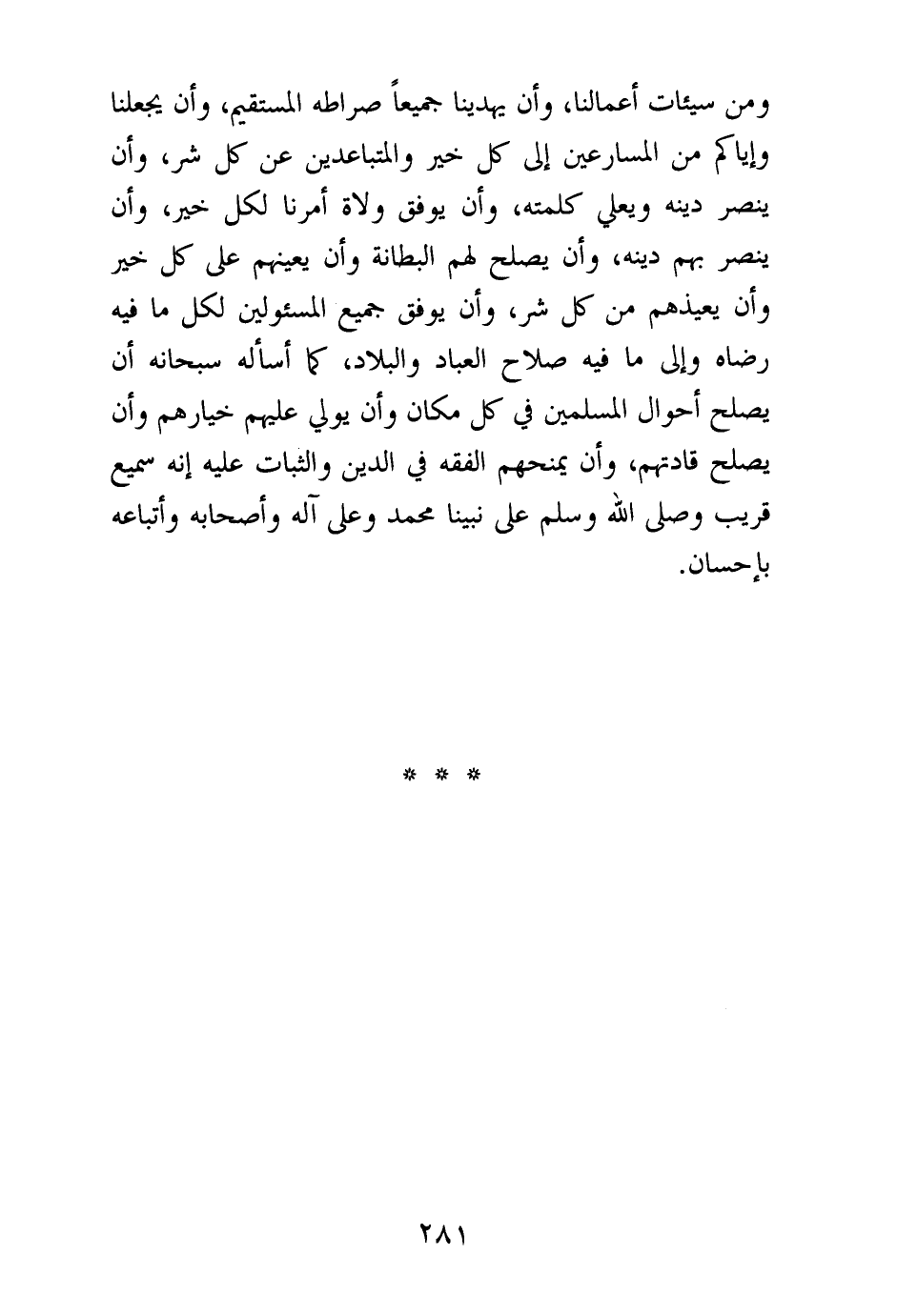 ومن سيئات أعمالنا، وأن يهدينا جميعا صراطه المستقيم، وأن يجعلنا وإياكم من المسارعين إلى كل خير والمتباعدين عن كل شر، وأن ينصر دينه ويعلي كلمته، وأن يوفق ولاة أمرنا لكل خير، وأن ينصر بهم دينه، وأن يصلح لهم البطانة وأن يعينهم على كل خير وأن يعيذهم من كل شر، وأن يوفق جميع المسئولين لكل ما فيه رضاه وإلى ما فيه صلاح العباد والبلاد، كما أسأله سبحانه أن يصلح أحوال المسلمين في كل مكان وأن يولي عليهم خيارهم وأن يصلح قادتهم، وأن يمنحهم الفقه في الدين والثبات عليه إنه سميع قريب وصلى الله وسلم على نبينا محمد وعلى آله وأصحابه وأتباعه بإحسان.