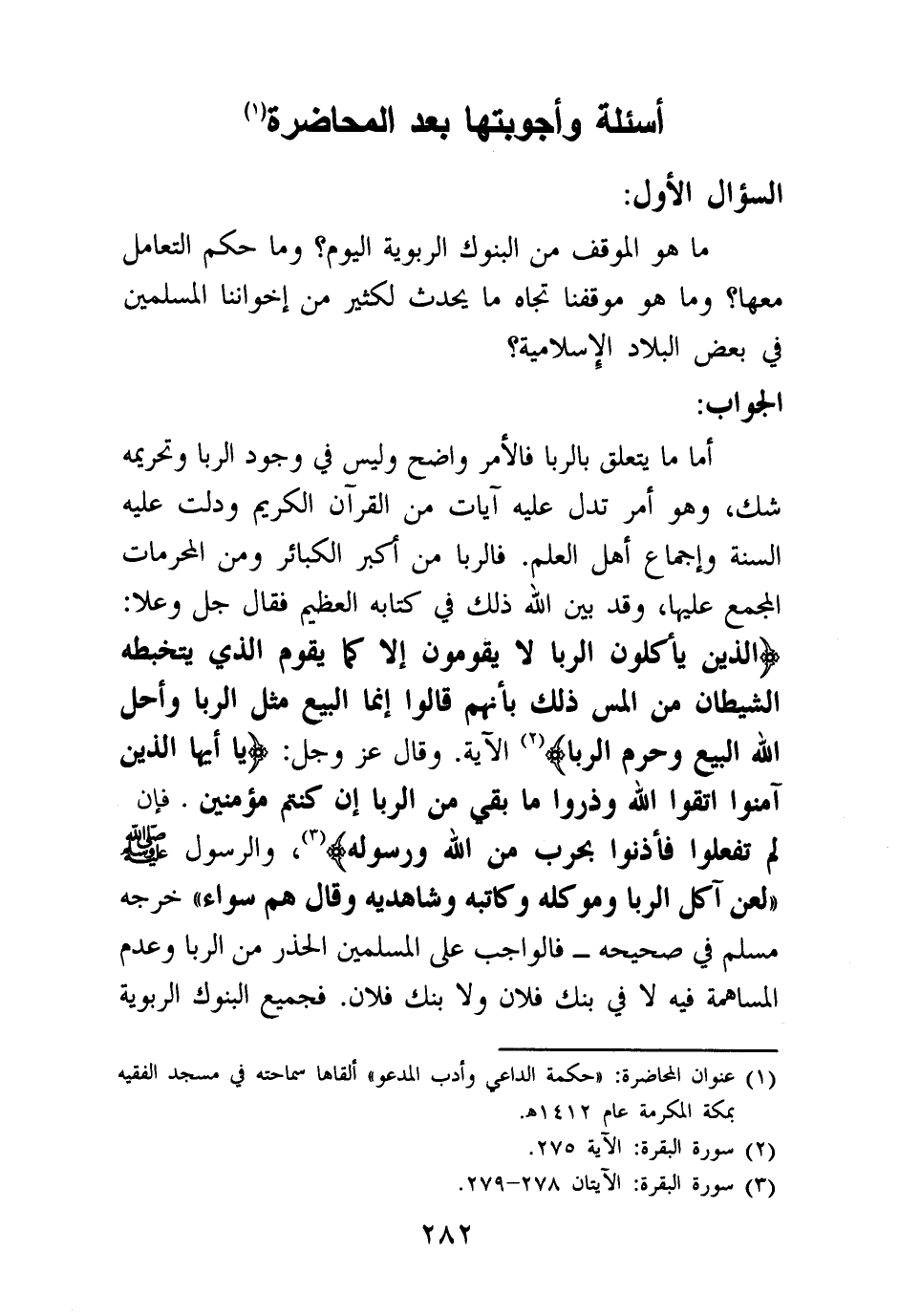 وقال عز وجل: {يَا أَيُّهَا الَّذِينَ آمَنُوا اتَّقُوا اللَّهَ وَذَرُوا مَا بَقِيَ مِنَ الرِّبَا إِنْ كُنْتُمْ مُؤْمِنِينَ} (¬2) {فَإِنْ لَمْ تَفْعَلُوا فَأْذَنُوا بِحَرْبٍ مِنَ اللَّهِ وَرَسُولِهِ} (¬3) والرسول صلى الله عليه وسلم «لعن آكل الربا وموكله وكاتبه وشاهديه وقال هم سواء (¬4) » ، خرجه مسلم في صحيحه - فالواجب على المسلمين الحذر من الربا وعدم المساهمة فيه لا في بنك فلان ولا بنك فلان. فجميع البنوك الربوية