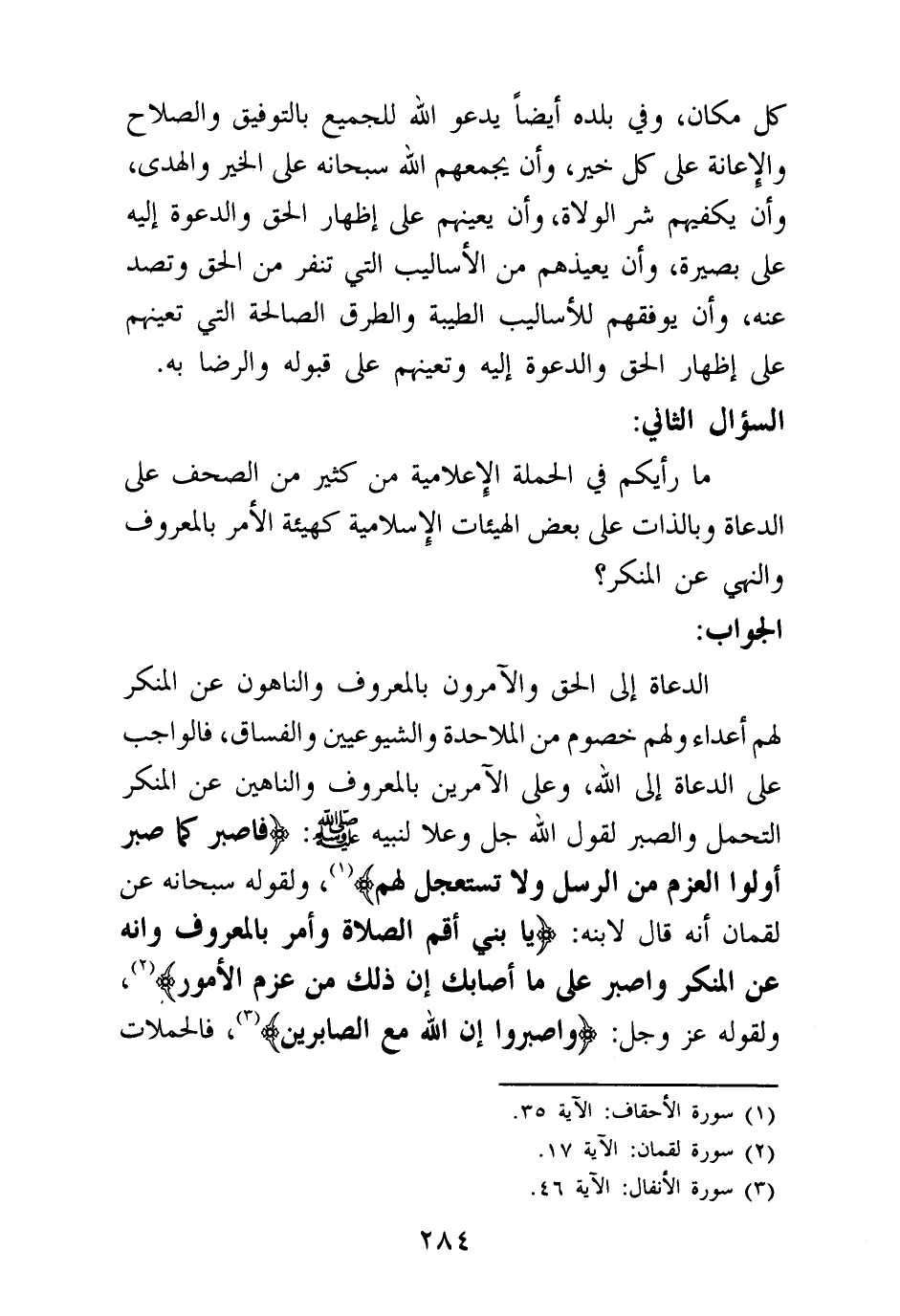 الدعاة إلى الحق والآمرون بالمعروف والناهون عن المنكر لهم أعداء ولهم خصوم من الملاحدة والشيوعيين والفساق، فالواجب على الدعاة إلى الله، وعلى الآمرين بالمعروف والناهين عن المنكر التحمل والصبر لقول الله جل وعلا لنبيه صلى الله عليه وسلم: {فَاصْبِرْ كَمَا صَبَرَ أُولُو الْعَزْمِ مِنَ الرُّسُلِ وَلَا تَسْتَعْجِلْ لَهُمْ} (¬1) ولقوله سبحانه عن لقمان أنه قال لابنه: {يَا بُنَيَّ أَقِمِ الصَّلَاةَ وَأْمُرْ بِالْمَعْرُوفِ وَانْهَ عَنِ الْمُنْكَرِ وَاصْبِرْ عَلَى مَا أَصَابَكَ إِنَّ ذَلِكَ مِنْ عَزْمِ الْأُمُورِ} (¬2) ولقوله عز وجل: {وَاصْبِرُوا إِنَّ اللَّهَ مَعَ الصَّابِرِينَ} (¬3)