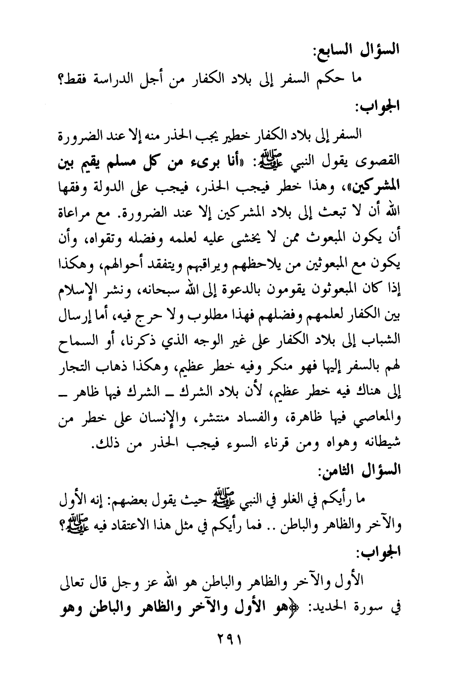 السفر إلى بلاد الكفار خطير يجب الحذر منه إلا عند الضرورة القصوى يقول النبي صلى الله عليه وسلم: «أنا بريء من كل مسلم يقيم بين المشركين (¬1) » ، وهذا خطر فيجب الحذر، فيجب على الدولة وفقها الله أن لا تبعث إلى بلاد المشركين إلا عند الضرورة. مع مراعاة أن يكون المبعوث ممن لا يخشى عليه لعلمه وفضله وتقواه، وأن يكون مع المبعوثين من يلاحظهم ويراقبهم ويتفقد أحوالهم، وهكذا إذا كان المبعوثون يقومون بالدعوة إلى الله سبحانه، ونشر الإسلام بين الكفار لعلمهم وفضلهم فهذا مطلوب ولا حرج فيه.