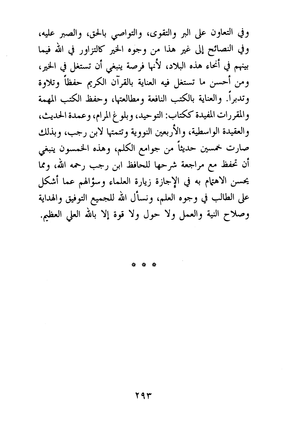 ومن أحسن ما تستغل فيه العناية بالقرآن الكريم حفظا وتلاوة وتدبرا. والعناية بالكتب النافعة ومطالعتها، وحفظ الكتب المهمة والمقررات المفيدة ككتاب: التوحيد، وبلوغ المرام، وعمدة الحديث، والعقيدة الواسطية، والأربعين النووية وتتمتها لابن رجب، وبذلك صارت خمسين حديثا من جوامع الكلم، وهذه الخمسون ينبغي أن تحفظ مع مراجعة شرحها للحافظ ابن رجب رحمه الله، ومما يحسن الاهتمام به في الإجازة زيارة العلماء وسؤالهم عما أشكل على الطالب في وجوه العلم، ونسأل الله للجميع التوفيق والهداية وصلاح النية والعمل ولا حول ولا قوة إلا بالله العلي العظيم.