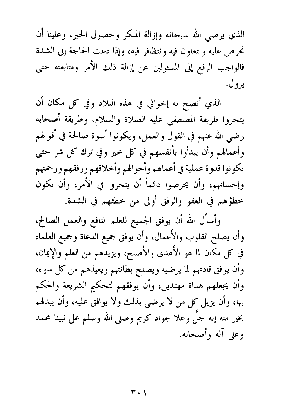 الذي أنصح به إخواني في هذه البلاد وفي كل مكان أن يتحروا طريقة المصطفى عليه الصلاة والسلام، وطريقة أصحابه رضي الله عنهم في القول والعمل، ويكونوا أسوة صالحة في أقوالهم وأعمالهم وأن يبدءوا بأنفسهم في كل خير وفي ترك كل شر حتى يكونوا قدوة عملية في أعمالهم وأحوالهم وأخلاقهم ورفقهم ورحمتهم وإحسانهم، وأن يحرصوا دائما أن يتحروا في الأمر، وأن يكون خطؤهم في العفو والرفق أولى من خطئهم في الشدة.