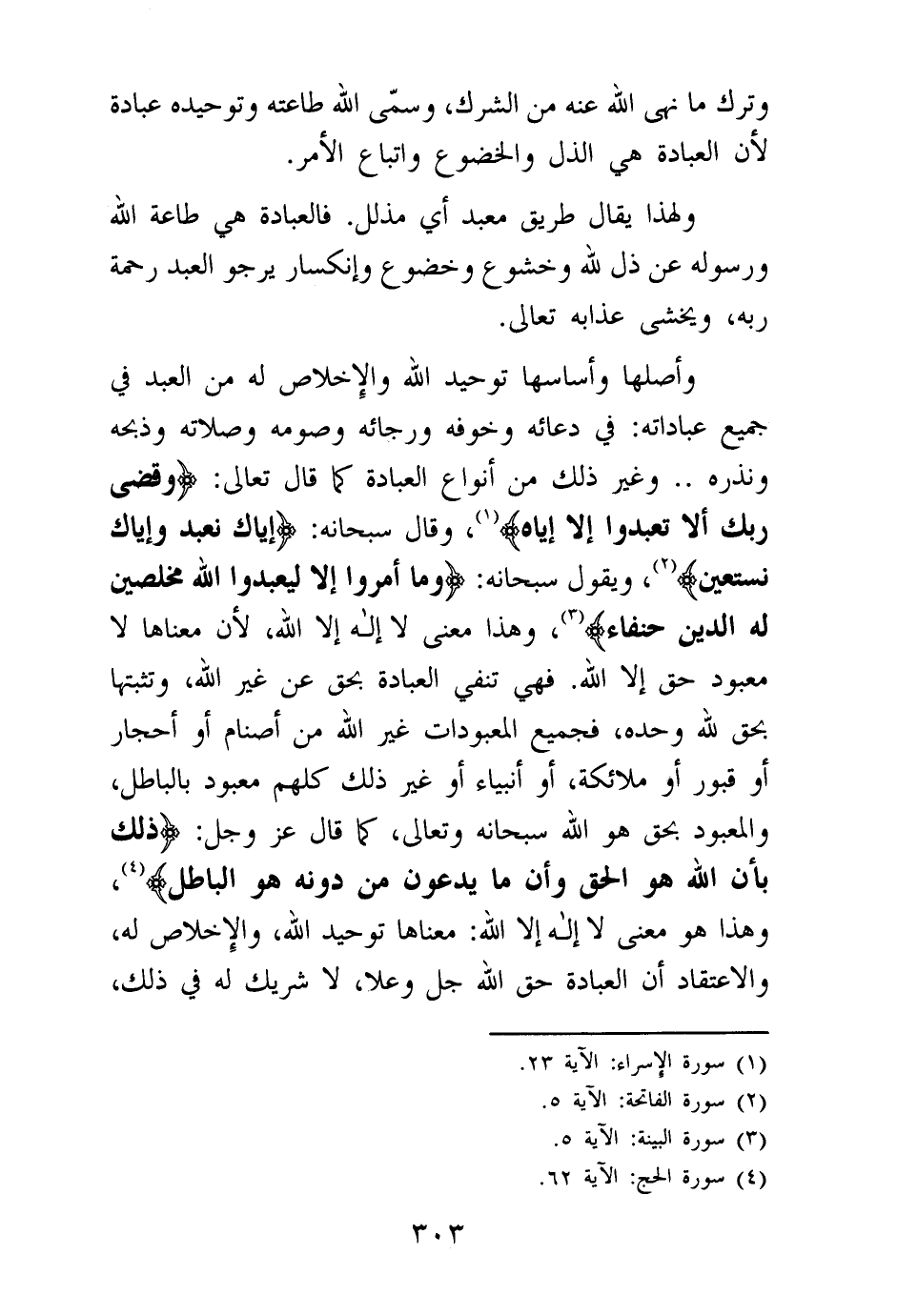 فهي تنفي العبادة بحق عن غير الله، وتثبتها بحق لله وحده، فجميع المعبودات غير الله من أصنام أو أحجار أو قبور أو ملائكة، أو أنبياء أو غير ذلك كلهم معبود بالباطل، والمعبود بحق هو الله سبحانه وتعالى، كما قال عز وجل: {ذَلِكَ بِأَنَّ اللَّهَ هُوَ الْحَقُّ وَأَنَّ مَا يَدْعُونَ مِنْ دُونِهِ هُوَ الْبَاطِلُ} (¬4) وهذا هو معنى لا إله إلا الله: معناها توحيد الله، والإخلاص له، والاعتقاد أن العبادة حق الله جل وعلا، لا شريك له في ذلك،