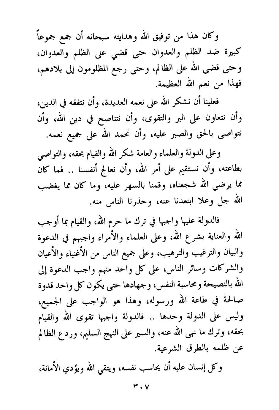 وعلى الدولة والعلماء والعامة شكر الله والقيام بحقه، والتواصي بطاعته، وأن نستقيم على أمر الله، وأن نعالج أنفسنا. فما كان مما يرضي الله شجعناه، وقمنا بالسهر عليه، وما كان مما يغضب الله جل وعلا ابتعدنا عنه، وحذرنا الناس منه.