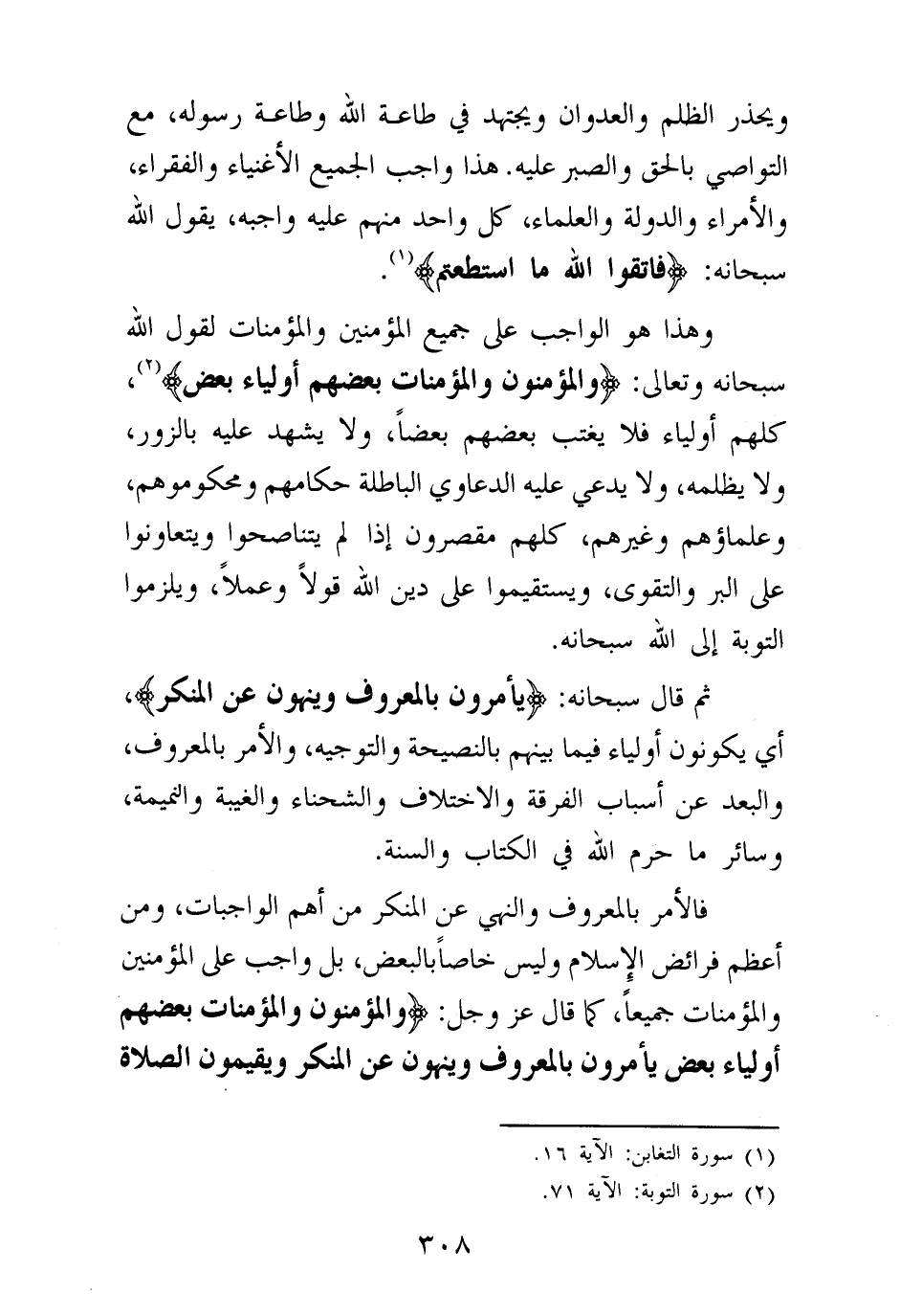 ويحذر الظلم والعدوان ويجتهد في طاعة الله وطاعة رسوله، مع التواصي بالحق والصبر عليه. هذا واجب الجميع الأغنياء والفقراء، والأمراء والدولة والعلماء، كل واحد منهم عليه واجبه، يقول الله سبحانه: {فَاتَّقُوا اللَّهَ مَا اسْتَطَعْتُمْ} (¬1)