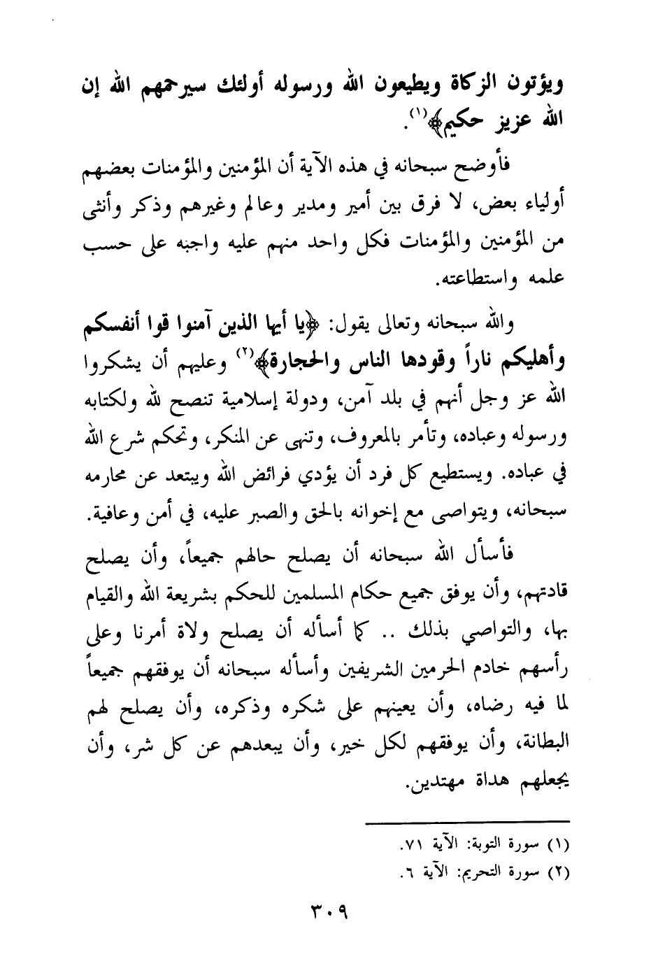 فأسأل الله سبحانه أن يصلح حالهم جميعا، وأن يصلح قادتهم، وأن يوفق جميع حكام المسلمين للحكم بشريعة الله والقيام بها، والتواصي بذلك. كما أسأله أن يصلح ولاة أمرنا وعلى رأسهم خادم الحرمين الشريفين، وأسأله سبحانه أن يوفقهم جميعا لما فيه رضاه، وأن يعينهم على شكره وذكره، وأن يصلح لهم البطانة، وأن يوفقهم لكل خير، وأن يبعدهم عن كل شر، وأن يجعلهم هداة مهتدين.