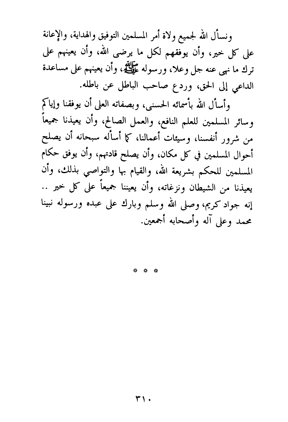 وأسأل الله بأسمائه الحسنى، وبصفاته العلى أن يوفقنا وإياكم وسائر المسلمين للعلم النافع، والعمل الصالح، وأن يعيذنا جميعا من شرور أنفسنا، وسيئات أعمالنا، كما أسأله سبحانه أن يصلح أحوال المسلمين في كل مكان، وأن يصلح قادتهم، وأن يوفق حكام المسلمين للحكم بشريعة الله، والقيام بها والتواصي بذلك، وأن يعيذنا من الشيطان ونزغاته، وأن يعيننا جميعا على كل خير. إنه جواد كريم، وصلى الله وسلم وبارك على عبده ورسوله نبينا محمد وعلى آله وأصحابه أجمعين.