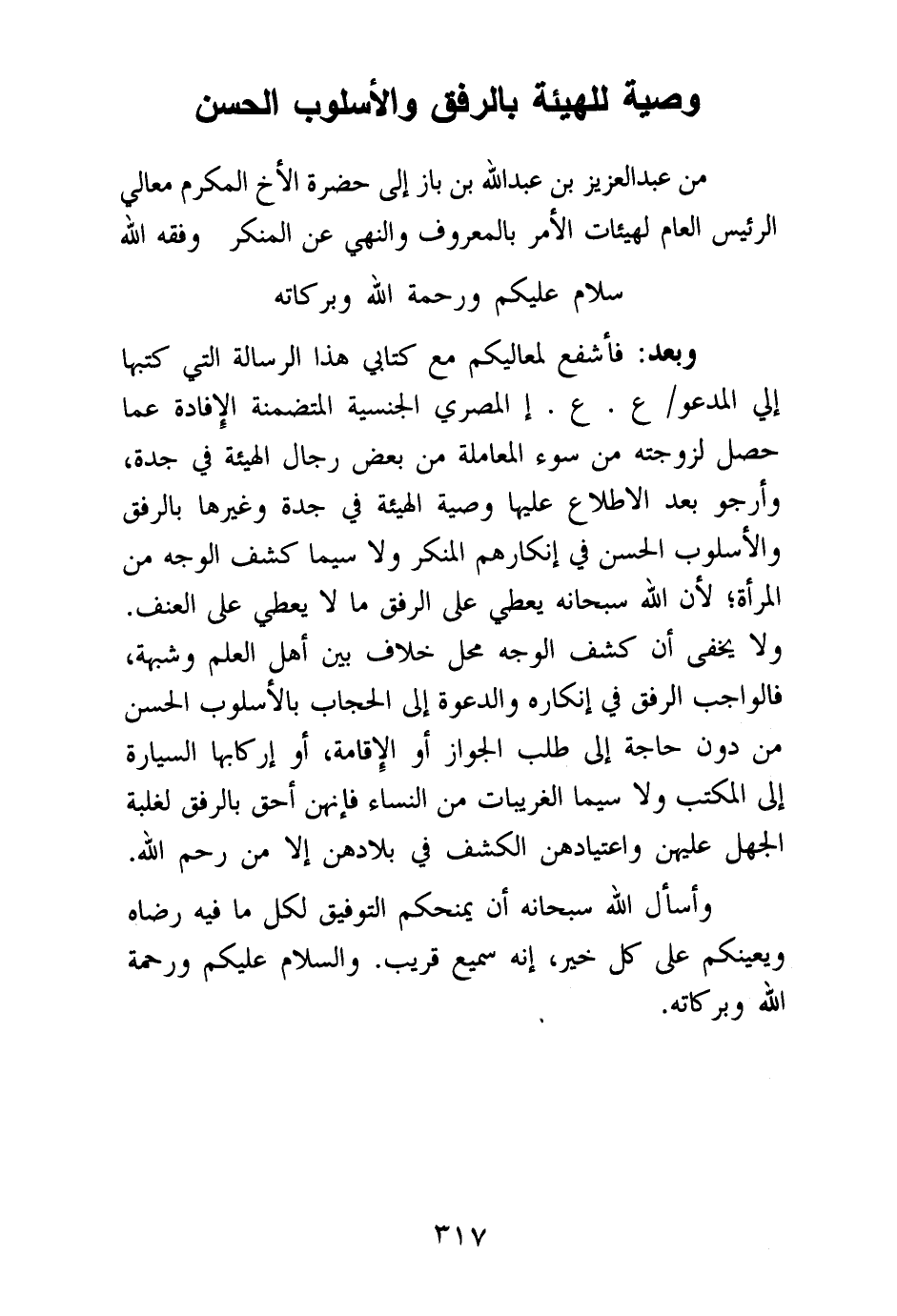 وبعد: فأشفع لمعاليكم مع كتابي هذا الرسالة التي كتبها إلي المدعو / ع. ع. إ المصري الجنسية المتضمنة الإفادة عما حصل لزوجته من سوء المعاملة من بعض رجال الهيئة في جدة، وأرجو بعد الاطلاع عليها وصية الهيئة في جدة وغيرها بالرفق والأسلوب الحسن في إنكارهم المنكر ولا سيما كشف الوجه من المرأة؛ لأن الله سبحانه يعطي على الرفق ما لا يعطي على العنف. ولا يخفى أن كشف الوجه محل خلاف بين أهل العلم وشبهة، فالواجب الرفق في إنكاره والدعوة إلى الحجاب بالأسلوب الحسن من دون حاجة إلى طلب الجواز أو الإقامة، أو إركابها السيارة إلى المكتب ولا سيما الغريبات من النساء فإنهن أحق بالرفق لغلبة الجهل عليهن واعتيادهن الكشف في بلادهن إلا من رحم الله.