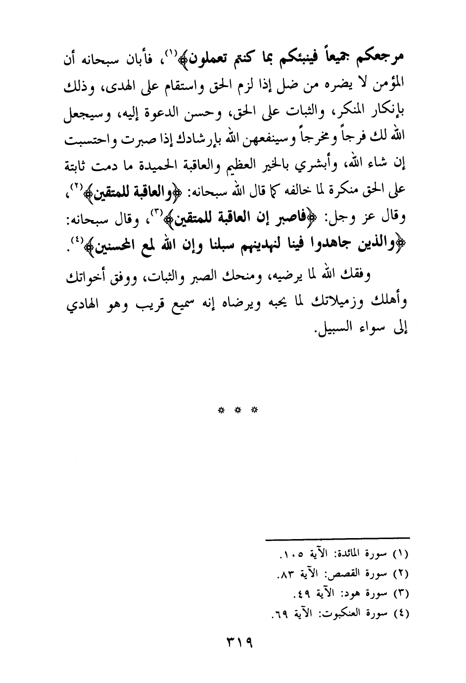 فأبان سبحانه أن المؤمن لا يضره من ضل إذا لزم الحق واستقام على الهدى، وذلك بإنكار المنكر، والثبات على الحق، وحسن الدعوة إليه، وسيجعل الله لك فرجا ومخرجا وسينفعهن الله بإرشادك إذا صبرت واحتسبت إن شاء الله، وأبشري بالخير العظيم والعاقبة الحميدة ما دمت ثابتة على الحق منكرة لما خالفه كما قال الله سبحانه: {وَالْعَاقِبَةُ لِلْمُتَّقِينَ} (¬1) وقال عز وجل: {فَاصْبِرْ إِنَّ الْعَاقِبَةَ لِلْمُتَّقِينَ} (¬2) وقال سبحانه: {وَالَّذِينَ جَاهَدُوا فِينَا لَنَهْدِيَنَّهُمْ سُبُلَنَا وَإِنَّ اللَّهَ لَمَعَ الْمُحْسِنِينَ} (¬3)