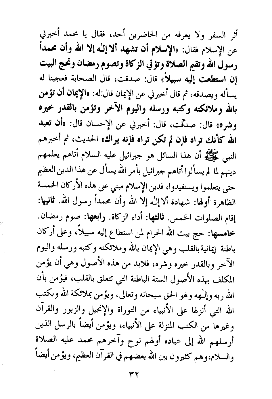 أثر السفر ولا يعرفه من الحاضرين أحد، فقال: يا محمد أخبرني عن الإسلام فقال: «الإسلام أن تشهد ألا إله إلا الله وأن محمدا رسول الله وتقيم الصلاة وتؤتي الزكاة وتصوم رمضان وتحج البيت إن استطعت إليه سبيلا قال: صدقت. قال الصحابة: فعجبنا له يسأله ويصدقه، ثم قال: أخبرني عن الإيمان. قال له: الإيمان أن تؤمن بالله وملائكته وكتبه ورسله واليوم الآخر وتؤمن بالقدر خيره وشره. قال: صدقت. قال: أخبرني عن الإحسان. قال أن تعبد الله كأنك تراه فإن لم تكن تراه فإنه يراك (¬1) » الحديث.