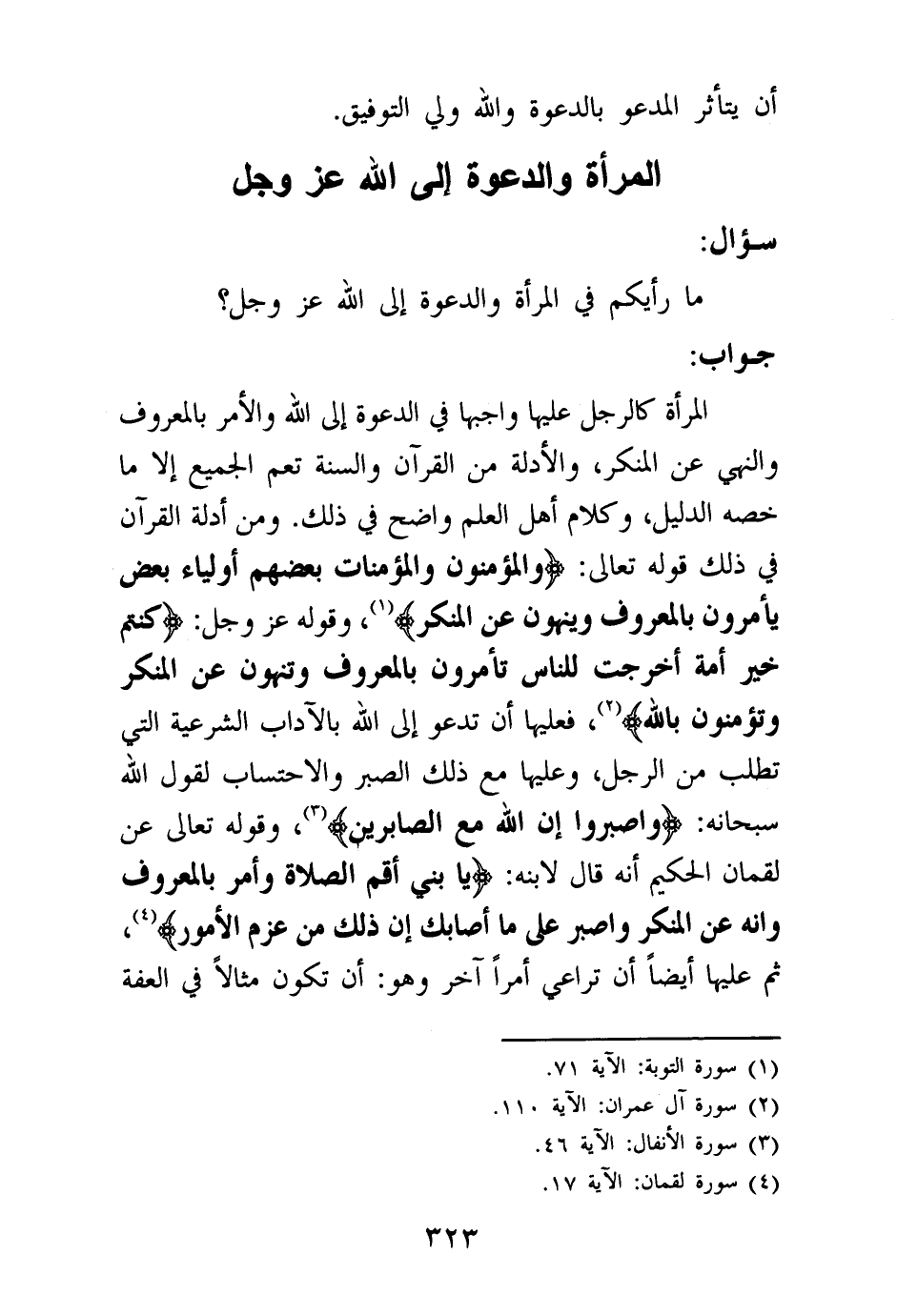 المرأة كالرجل عليها واجبها في الدعوة إلى الله والأمر بالمعروف والنهي عن المنكر، والأدلة من القرآن والسنة تعم الجميع إلا ما خصه الدليل، وكلام أهل العلم واضح في ذلك. ومن أدلة القرآن في ذلك قوله تعالى: {وَالْمُؤْمِنُونَ وَالْمُؤْمِنَاتُ بَعْضُهُمْ أَوْلِيَاءُ بَعْضٍ يَأْمُرُونَ بِالْمَعْرُوفِ وَيَنْهَوْنَ عَنِ الْمُنْكَرِ} (¬1) وقوله عز وجل: {كُنْتُمْ خَيْرَ أُمَّةٍ أُخْرِجَتْ لِلنَّاسِ تَأْمُرُونَ بِالْمَعْرُوفِ وَتَنْهَوْنَ عَنِ الْمُنْكَرِ وَتُؤْمِنُونَ بِاللَّهِ} (¬2)