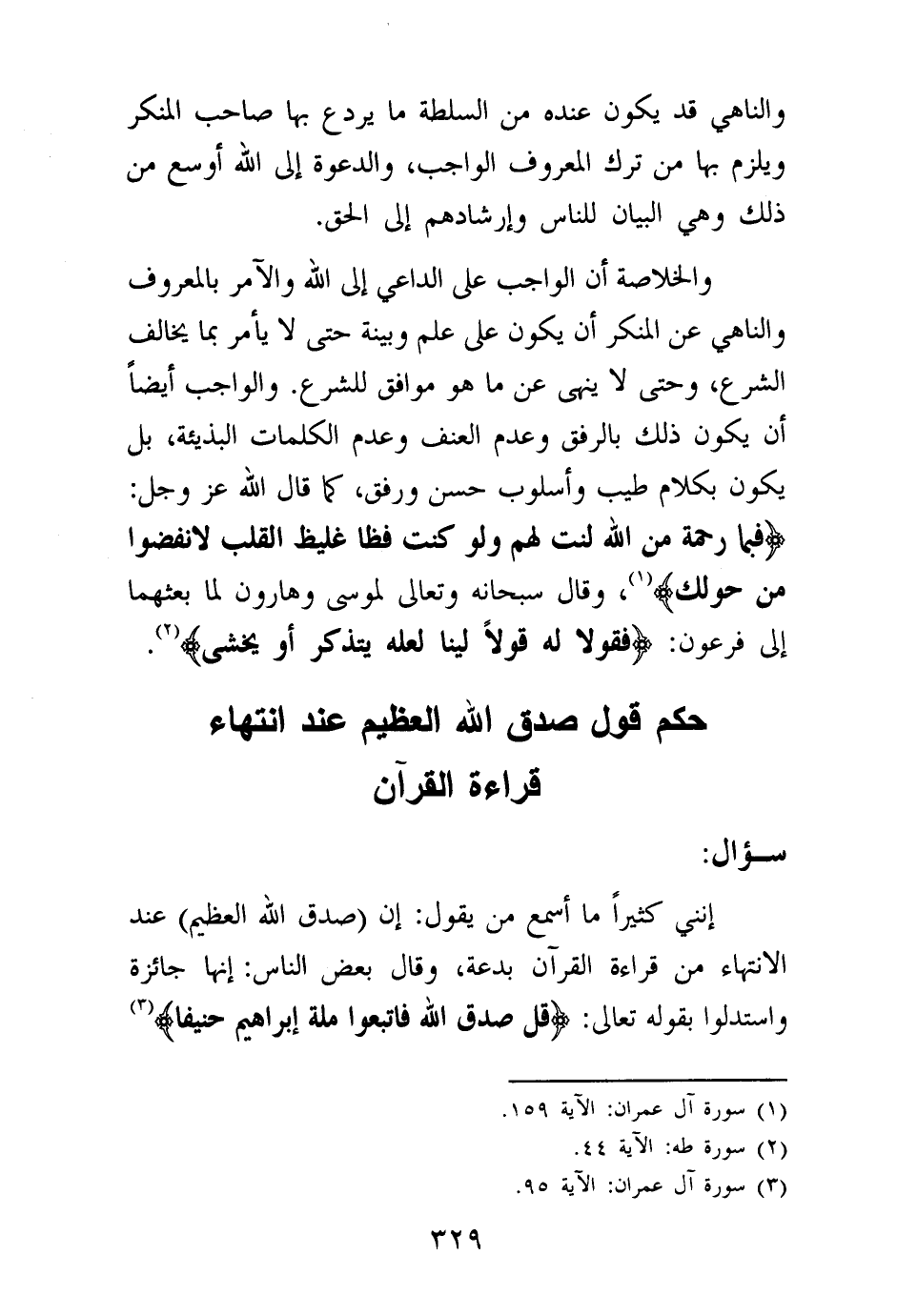 إنني كثيرا ما أسمع من يقول: إن (صدق الله العظيم) عند الانتهاء من قراءة القرآن بدعة، وقال بعض الناس: إنها جائزة واستدلوا بقوله تعالى: {قُلْ صَدَقَ اللَّهُ فَاتَّبِعُوا مِلَّةَ إِبْرَاهِيمَ حَنِيفًا} (¬1)