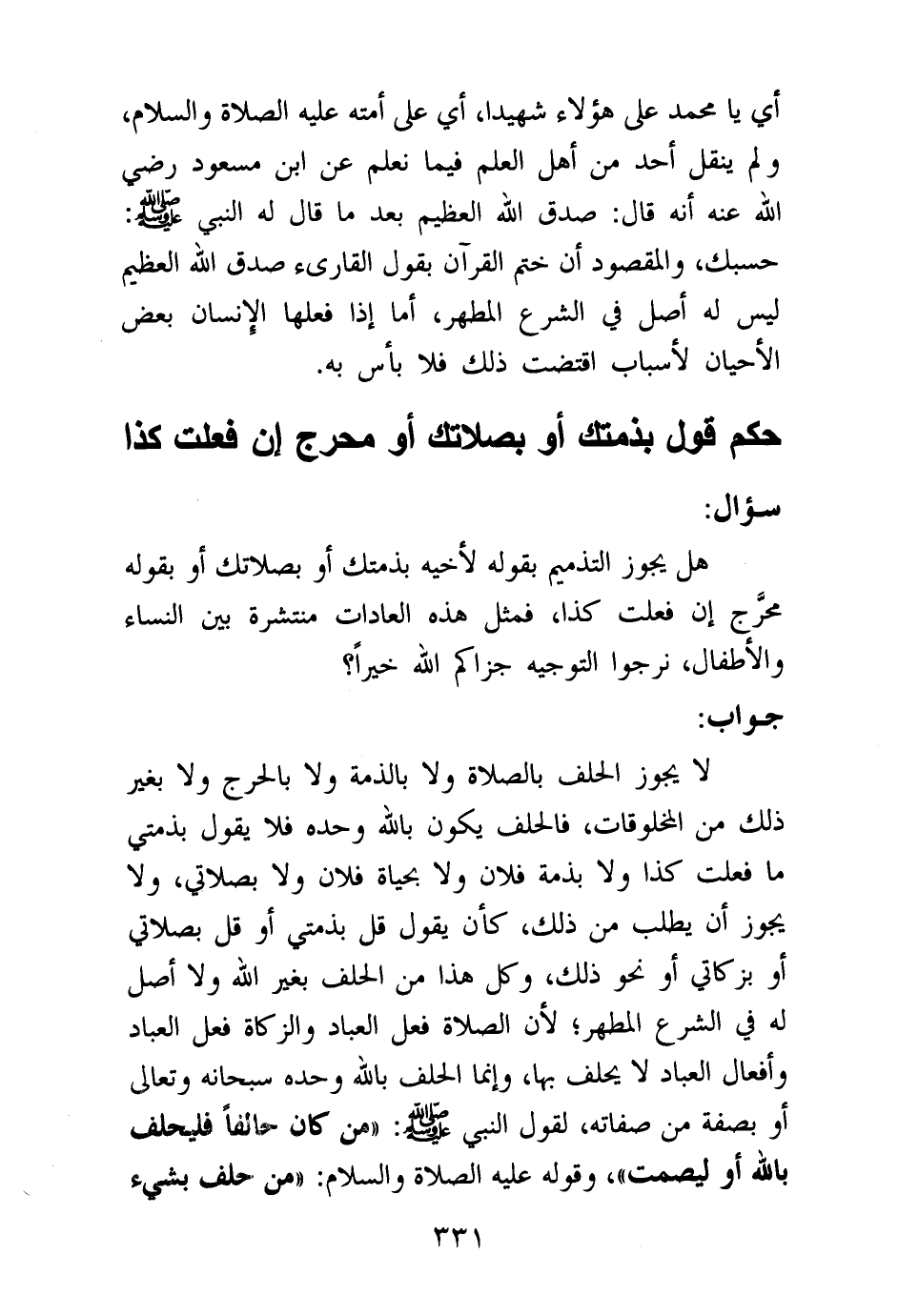 لا يجوز الحلف بالصلاة ولا بالذمة ولا بالحرج ولا بغير ذلك من المخلوقات، فالحلف يكون بالله وحده فلا يقول: بذمتي ما فعلت كذا ولا بذمة فلان ولا بحياة فلان ولا بصلاتي، ولا يجوز أن يطلب من ذلك، كأن يقول: قل: بذمتي أو قل: بصلاتي أو بزكاتي أو نحو ذلك، وكل هذا من الحلف بغير الله ولا أصل له في الشرع المطهر؛ لأن الصلاة فعل العباد والزكاة فعل العباد وأفعال العباد لا يحلف بها، وإنما الحلف بالله وحده سبحانه وتعالى أو بصفة من صفاته، لقول النبي صلى الله عليه وسلم: «من كان حالفا فليحلف بالله أو ليصمت (¬1) » ، وقوله عليه الصلاة والسلام: «من حلف بشيء دون الله فقد أشرك (¬2) »