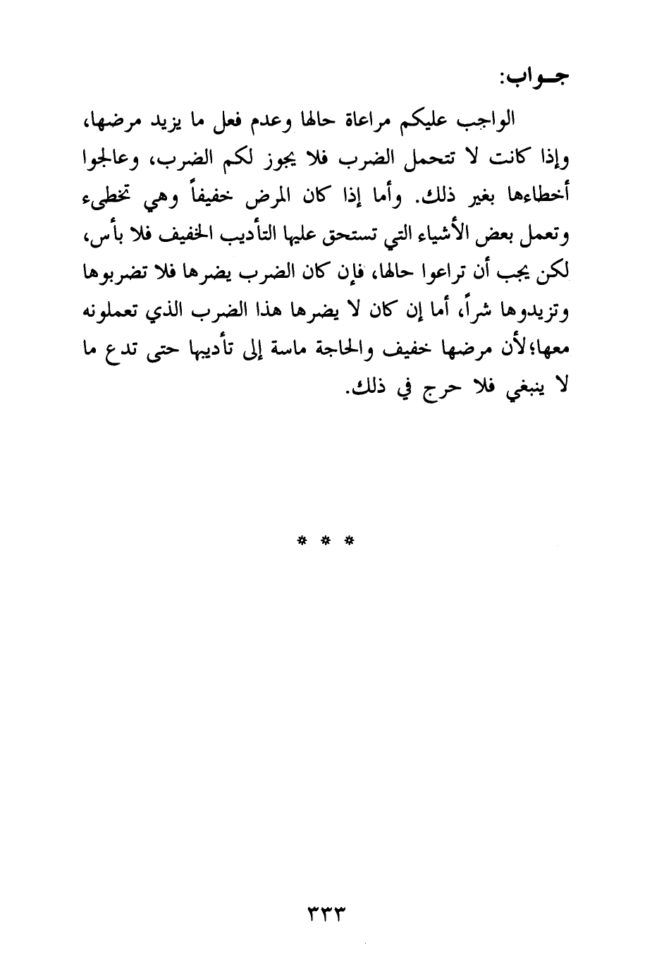 الواجب عليكم مراعاة حالها وعدم فعل ما يزيد مرضها، وإذا كانت لا تتحمل الضرب فلا يجوز لكم الضرب، وعالجوا أخطاءها بغير ذلك. وأما إذا كان المرض خفيفا وهي تخطئ وتعمل بعض الأشياء التي تستحق عليها التأديب الخفيف فلا بأس، لكن يجب أن تراعوا حالها، فإن كان الضرب يضرها فلا تضربوها وتزيدوها شرا، أما إن كان لا يضرها هذا الضرب الذي تعملونه معها؛ لأن مرضها خفيف والحاجة ماسة إلى تأديبها حتى تدع ما لا ينبغي فلا حرج في ذلك.
