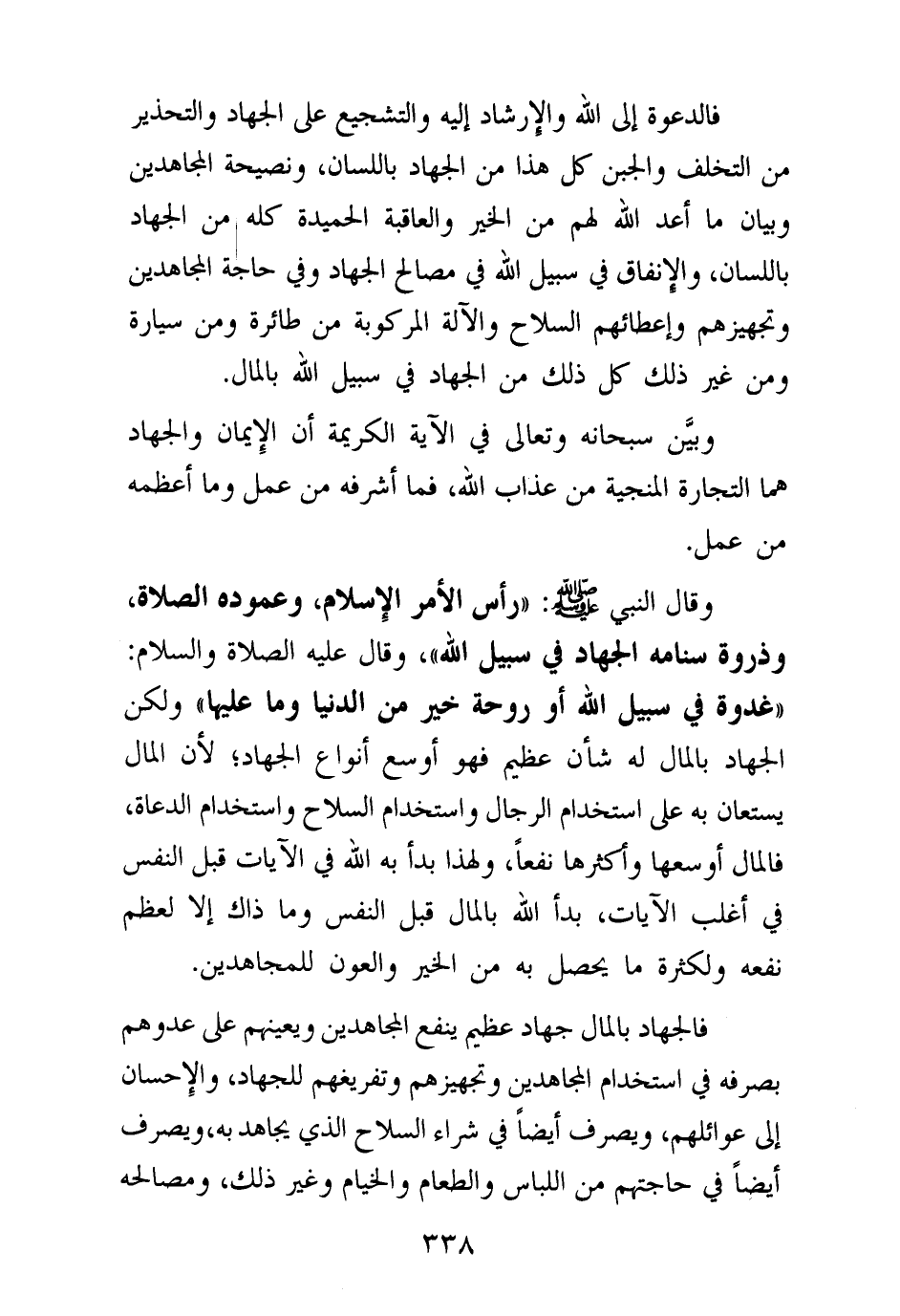 وقال النبي صلى الله عليه وسلم: «رأس الأمر الإسلام وعموده الصلاة وذروة سنامه الجهاد في سبيل الله (¬1) » ، وقال عليه الصلاة والسلام: «غدوة في سبيل الله أو روحة خير من الدنيا وما عليها (¬2) » ، ولكن الجهاد بالمال له شأن عظيم فهو أوسع أنواع الجهاد؛ لأن المال يستعان به على استخدام الرجال واستخدام السلاح واستخدام الدعاة، فالمال أوسعها وأكثرها نفعا، ولهذا بدأ به الله في الآيات قبل النفس في أغلب الآيات، بدأ الله بالمال قبل النفس وما ذاك إلا لعظم نفعه ولكثرة ما يحصل به من الخير والعون للمجاهدين.