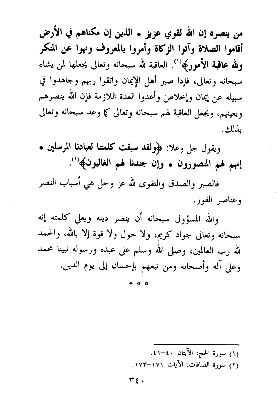 {وَلَيَنْصُرَنَّ اللَّهُ مَنْ يَنْصُرُهُ إِنَّ اللَّهَ لَقَوِيٌّ عَزِيزٌ} (¬1) {الَّذِينَ إِنْ مَكَّنَّاهُمْ فِي الْأَرْضِ أَقَامُوا الصَّلَاةَ وَآتَوُا الزَّكَاةَ وَأَمَرُوا بِالْمَعْرُوفِ وَنَهَوْا عَنِ الْمُنْكَرِ وَلِلَّهِ عَاقِبَةُ الْأُمُورِ} (¬2)