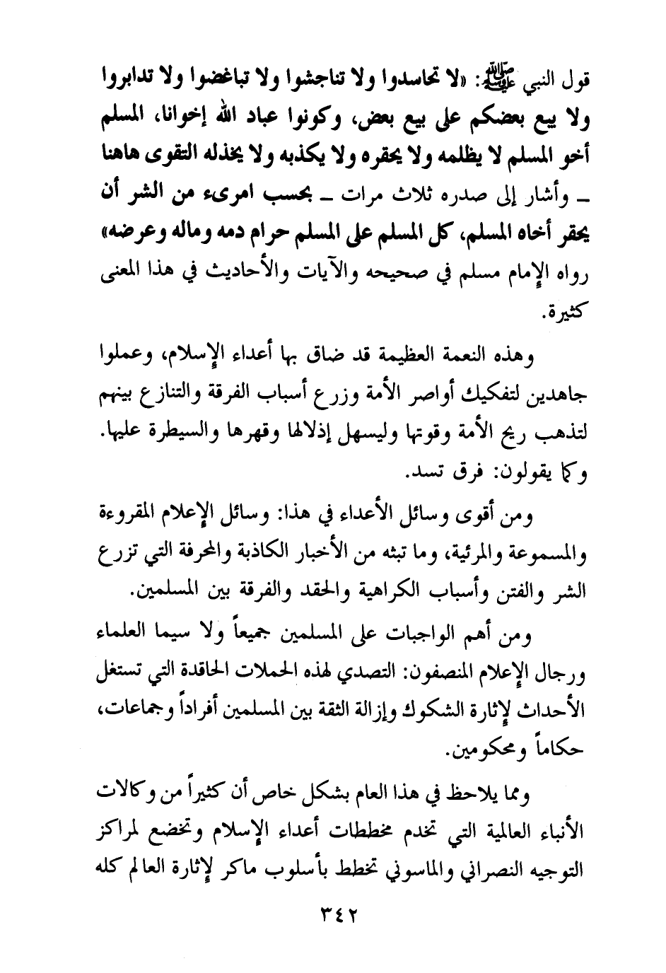 قول النبي صلى الله عليه وسلم: «لا تحاسدوا ولا تناجشوا ولا تباغضوا ولا تدابروا ولا يبع بعضكم على بيع بعض وكونوا عباد الله إخوانا المسلم أخو المسلم لا يظلمه ولا يحقره ولا يكذبه ولا يخذله التقوى هاهنا - وأشار إلى صدره ثلاث مرات - بحسب امرئ من الشر أن يحقر أخاه المسلم كل المسلم على المسلم حرام دمه وماله وعرضه (¬1) » رواه الإمام مسلم في صحيحه، والآيات والأحاديث في هذا المعنى كثيرة.