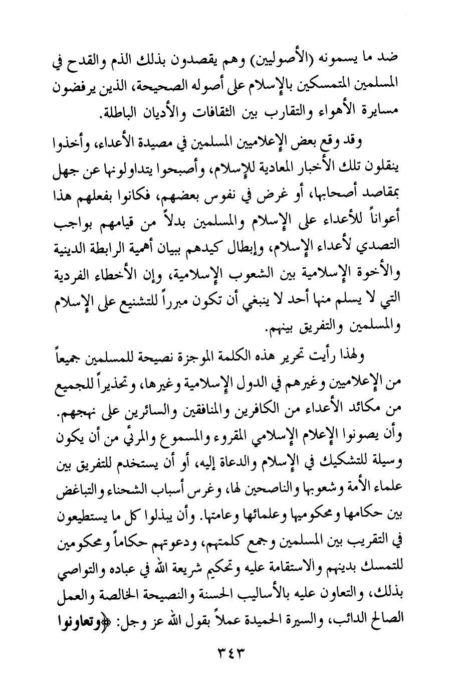 ولهذا رأيت تحرير هذه الكلمة الموجزة نصيحة للمسلمين جميعا من الإعلاميين وغيرهم في الدول الإسلامية وغيرها، وتحذيرا للجميع من مكائد الأعداء من الكافرين والمنافقين والسائرين على نهجهم. وأن يصونوا الإعلام الإسلامي المقروء والمسموع والمرئي من أن يكون وسيلة للتشكيك في الإسلام والدعاة إليه، أو أن يستخدم للتفريق بين علماء الأمة وشعوبها والناصحين لها، وغرس أسباب الشحناء والتباغض بين حكامها ومحكوميها وعلمائها وعامتها. وأن يبذلوا كل ما يستطيعون في التقريب بين المسلمين وجمع كلمتهم، ودعوتهم حكاما ومحكومين للتمسك بدينهم والاستقامة عليه وتحكيم شريعة الله في عباده والتواصي بذلك، والتعاون عليه بالأساليب الحسنة والنصيحة الخالصة والعمل الصالح الدائب، والسيرة الحميدة عملا بقول الله عز وجل: