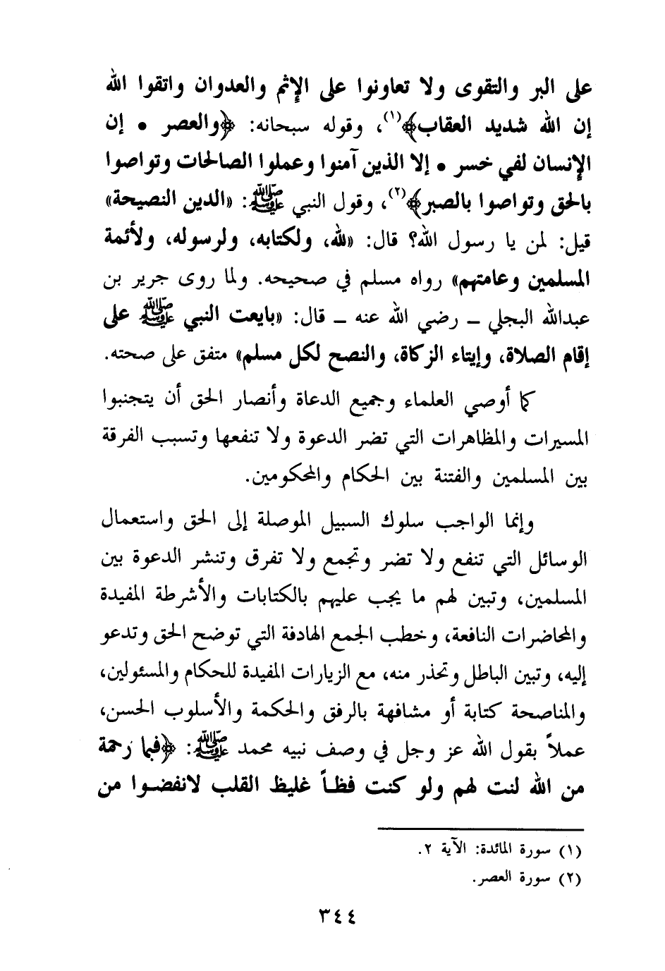 {وَتَعَاوَنُوا عَلَى الْبِرِّ وَالتَّقْوَى وَلَا تَعَاوَنُوا عَلَى الْإِثْمِ وَالْعُدْوَانِ وَاتَّقُوا اللَّهَ إِنَّ اللَّهَ شَدِيدُ الْعِقَابِ} (¬1) وقوله سبحانه: {وَالْعَصْرِ} (¬2) {إِنَّ الْإِنْسَانَ لَفِي خُسْرٍ} (¬3) {إِلَّا الَّذِينَ آمَنُوا وَعَمِلُوا الصَّالِحَاتِ وَتَوَاصَوْا بِالْحَقِّ وَتَوَاصَوْا بِالصَّبْرِ} (¬4) وقول النبي صلى الله عليه وسلم: «الدين النصيحة قيل: لمن يا رسول الله؟ قال: لله ولكتابه ولرسوله ولأئمة المسلمين وعامتهم (¬5) » رواه مسلم في صحيحه.
