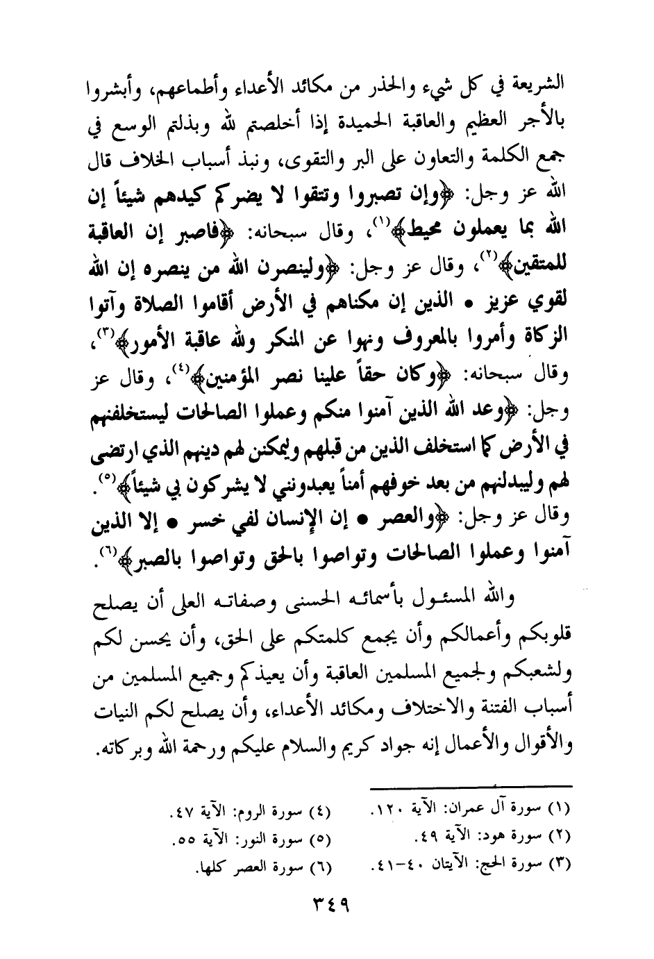الشريعة في كل شيء والحذر من مكائد الأعداء وأطماعهم، وأبشروا بالأجر العظيم والعاقبة الحميدة إذا أخلصتم لله وبذلتم الوسع في جمع الكلمة والتعاون على البر والتقوى، ونبذ أسباب الخلاف قال الله عز وجل: {وَإِنْ تَصْبِرُوا وَتَتَّقُوا لَا يَضُرُّكُمْ كَيْدُهُمْ شَيْئًا إِنَّ اللَّهَ بِمَا يَعْمَلُونَ مُحِيطٌ} (¬1) وقال سبحانه: {فَاصْبِرْ إِنَّ الْعَاقِبَةَ لِلْمُتَّقِينَ} (¬2) وقال عز وجل: {وَلَيَنْصُرَنَّ اللَّهُ مَنْ يَنْصُرُهُ إِنَّ اللَّهَ لَقَوِيٌّ عَزِيزٌ} (¬3) {الَّذِينَ إِنْ مَكَّنَّاهُمْ فِي الْأَرْضِ أَقَامُوا الصَّلَاةَ وَآتَوُا الزَّكَاةَ وَأَمَرُوا بِالْمَعْرُوفِ وَنَهَوْا عَنِ الْمُنْكَرِ وَلِلَّهِ عَاقِبَةُ الْأُمُورِ} (¬4) وقال سبحانه: {وَكَانَ حَقًّا عَلَيْنَا نَصْرُ الْمُؤْمِنِينَ} (¬5)