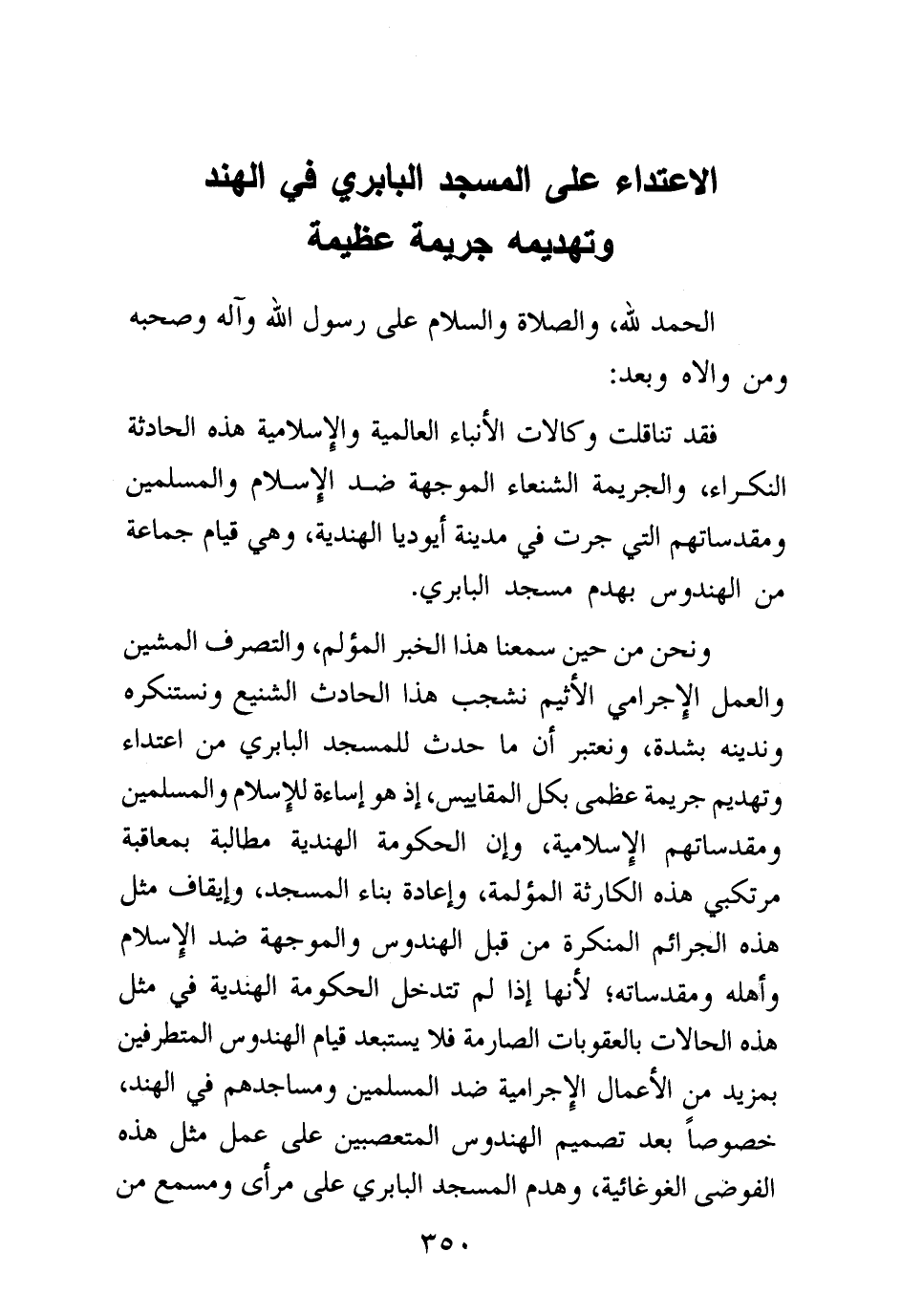 ونحن من حين سمعنا هذا الخبر المؤلم، والتصرف المشين والعمل الإجرامي الأثيم نشجب هذا الحادث الشنيع ونستنكره وندينه بشدة، ونعتبر أن ما حدث للمسجد البابري من اعتداء وتهديم جريمة عظمى بكل المقاييس، إذ هو إساءة للإسلام والمسلمين ومقدساتهم الإسلامية، وإن الحكومة الهندية مطالبة بمعاقبة مرتكبي هذه الكارثة المؤلمة، وإعادة بناء المسجد، وإيقاف مثل هذه الجرائم المنكرة من قبل الهندوس والموجهة ضد الإسلام وأهله ومقدساته؛ لأنها إذا لم تتدخل الحكومة الهندية في مثل هذه الحالات بالعقوبات الصارمة فلا يستبعد قيام الهندوس المتطرفين بمزيد من الأعمال الإجرامية ضد المسلمين ومساجدهم في الهند، خصوصا بعد تصميم الهندوس المتعصبين على عمل مثل هذه الفوضى الغوغائية، وهدم المسجد البابري على مرأى ومسمع من