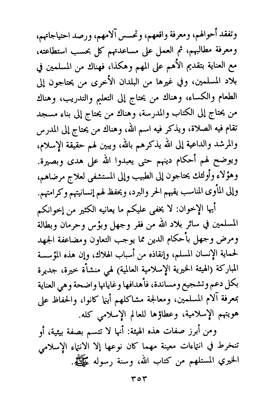 أيها الإخوان: لا يخفى عليكم ما يعانيه الكثير من إخوانكم المسلمين في سائر بلاد الله من فقر وجهل وبؤس وحرمان وبطالة ومرض وجهل بأحكام الدين مما يوجب التعاون ومضاعفة الجهد لحماية الإنسان المسلم، وإنقاذه من أسباب الهلاك، وإن هذه المؤسسة المباركة (الهيئة الخيرية الإسلامية العالمية) لهي منشأة خيرة، جديرة بكل دعم وتشجيع ومساندة، فأهدافها وغاياتها واضحة وهي العناية بمعرفة آلام المسلمين، ومعالجة مشاكلهم أينما كانوا، والحفاظ على هويتهم الإسلامية، وعطاؤها للعالم الإسلامي كله. ومن أبرز صفات هذه الهيئة: أنها لا تتسم بصفة بيئية، أو تنخرط في انتماءات معينة مهما كان نوعها إلا الانتماء الإسلامي الخيري المستلهم من كتاب الله، وسنة رسوله صلى الله عليه وسلم.