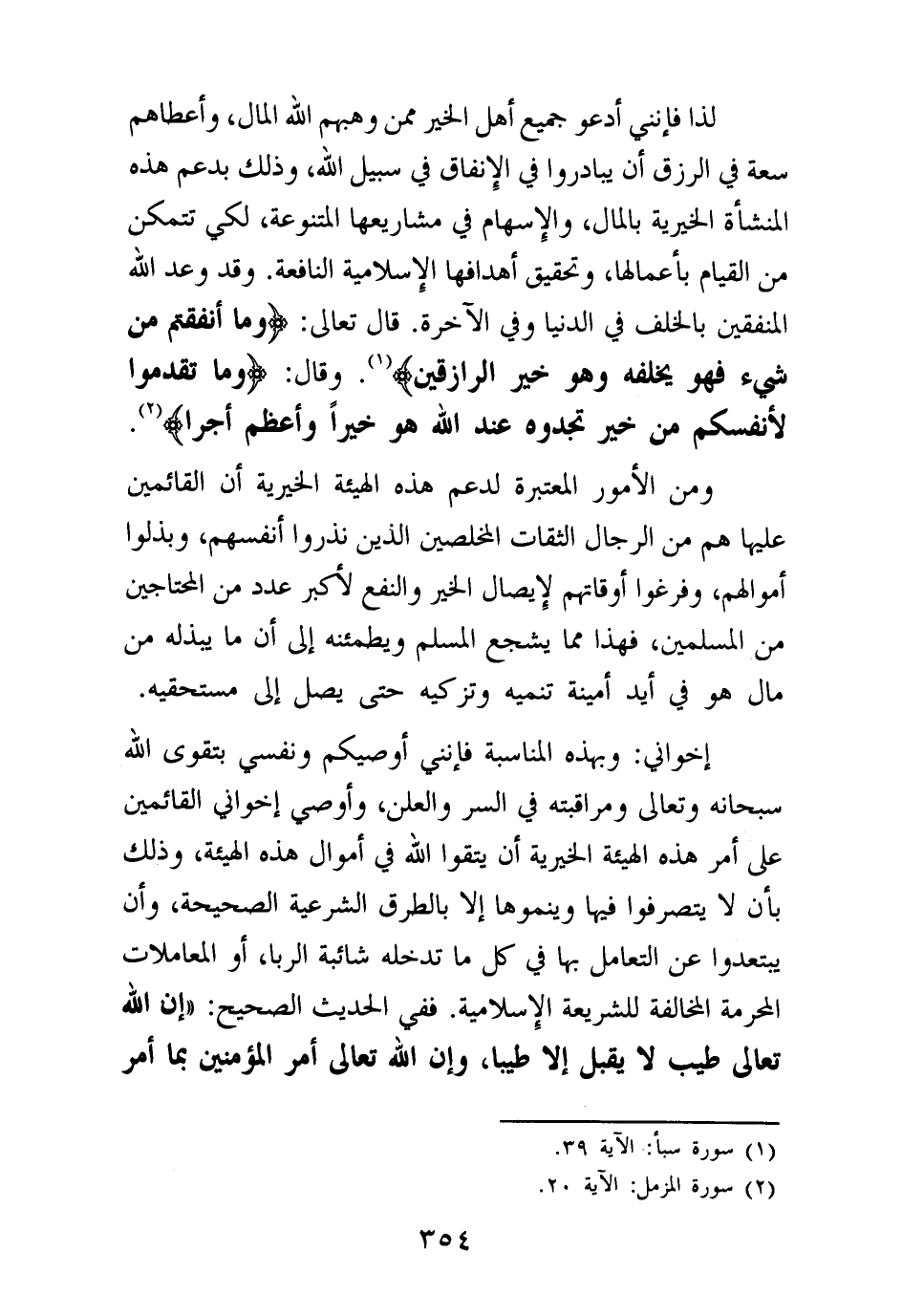 إخواني: وبهذه المناسبة فإنني أوصيكم ونفسي بتقوى الله سبحانه وتعالى ومراقبته في السر والعلن، وأوصي إخواني القائمين على أمر هذه الهيئة الخيرية أن يتقوا الله في أموال هذه الهيئة، وذلك بأن لا يتصرفوا فيها وينموها إلا بالطرق الشرعية الصحيحة، وأن يبتعدوا عن التعامل بها في كل ما تدخله شائبة الربا، أو المعاملات المحرمة المخالفة للشريعة الإسلامية. ففي الحديث الصحيح: «إن الله تعالى طيب لا يقبل إلا طيبا وإن الله تعالى أمر المؤمنين بما أمر به المرسلين (¬3) » ،