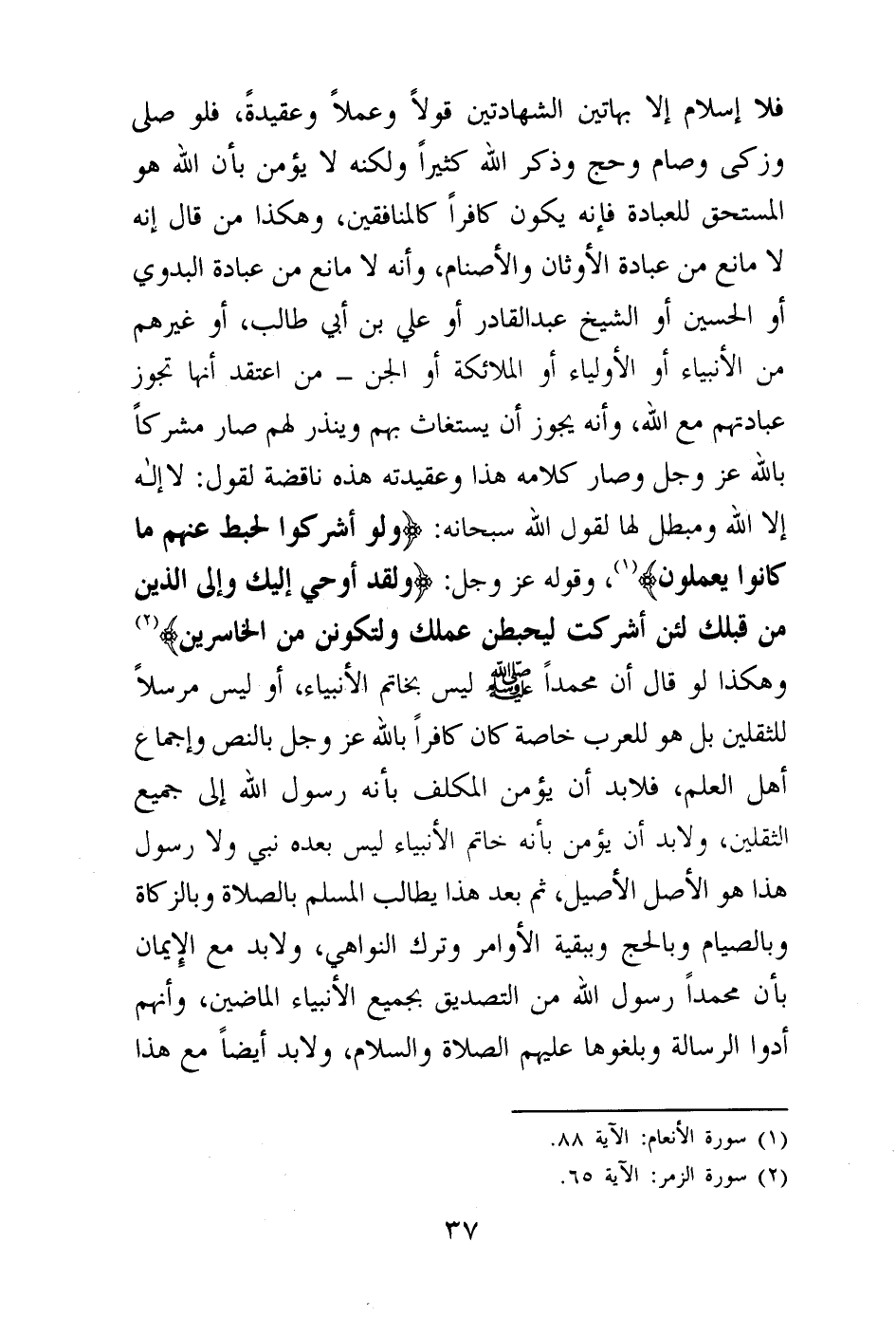 فلا إسلام إلا بهاتين الشهادتين قولا وعملا وعقيدة، فلو صلى وزكى وصام وحج وذكر الله كثيرا ولكنه لا يؤمن بأن الله هو المستحق للعبادة فإنه يكون كافرا كالمنافقين، وهكذا من قال: إنه لا مانع من عبادة الأوثان والأصنام، وإنه لا مانع من عبادة البدوي أو الحسين أو الشيخ عبد القادر أو علي بن أبي طالب، أو غيرهم من الأنبياء أو الأولياء أو الملائكة أو الجن - من اعتقد أنها تجوز عبادتهم مع الله، وأنه يجوز أن يستغاث بهم وينذر لهم صار مشركا بالله عز وجل وصار كلامه هذا وعقيدته هذه ناقضة لقول: لا إله إلا الله ومبطل لها لقول الله سبحانه: {وَلَوْ أَشْرَكُوا لَحَبِطَ عَنْهُمْ مَا كَانُوا يَعْمَلُونَ} (¬1) وقوله عز وجل: {وَلَقَدْ أُوحِيَ إِلَيْكَ وَإِلَى الَّذِينَ مِنْ قَبْلِكَ لَئِنْ أَشْرَكْتَ لَيَحْبَطَنَّ عَمَلُكَ وَلَتَكُونَنَّ مِنَ الْخَاسِرِينَ} (¬2) وهكذا لو قال: إن محمدا صلى الله عليه وسلم ليس بخاتم الأنبياء، أو ليس مرسلا للثقلين بل هو للعرب خاصة كان كافرا بالله عز وجل بالنص وإجماع أهل العلم، فلا بد أن يؤمن المكلف بأنه رسول الله إلى جميع الثقلين، ولا بد أن يؤمن بأنه خاتم الأنبياء ليس بعده نبي ولا رسول هذا هو الأصل الأصيل، ثم بعد هذا يطالب المسلم بالصلاة وبالزكاة وبالصيام وبالحج وببقية الأوامر وترك النواهي، ولا بد مع الإيمان بأن محمدا رسول الله من التصديق بجميع الأنبياء الماضين، وأنهم أدوا الرسالة وبلغوها عليهم الصلاة والسلام، ولا بد أيضا مع هذا